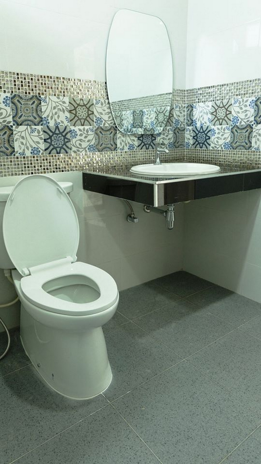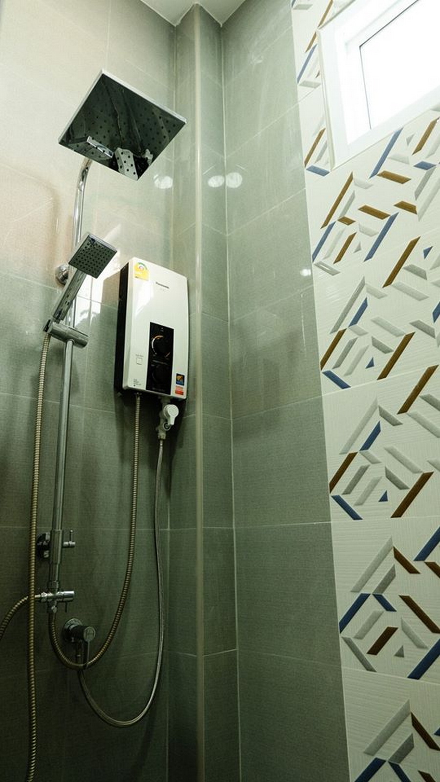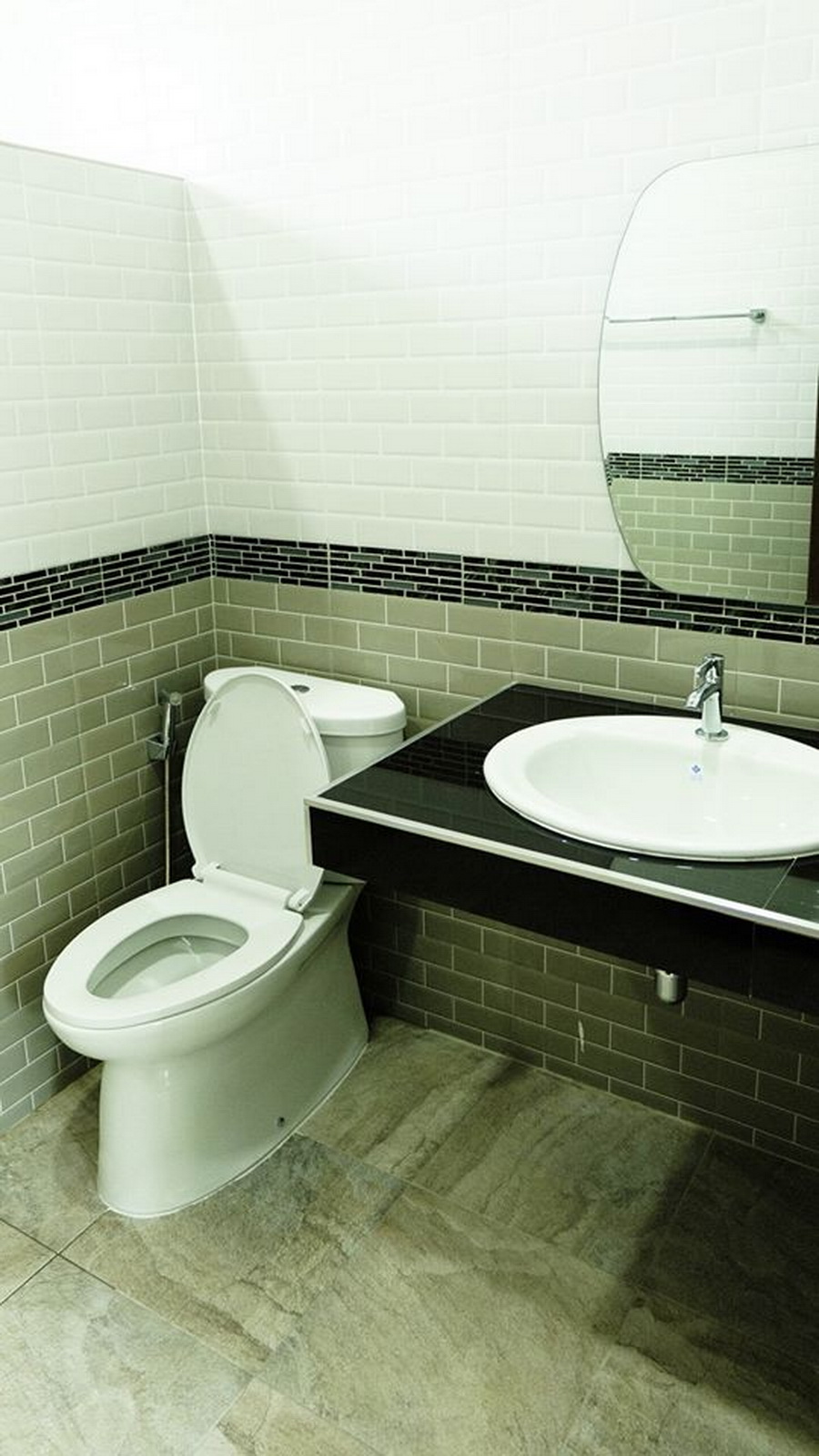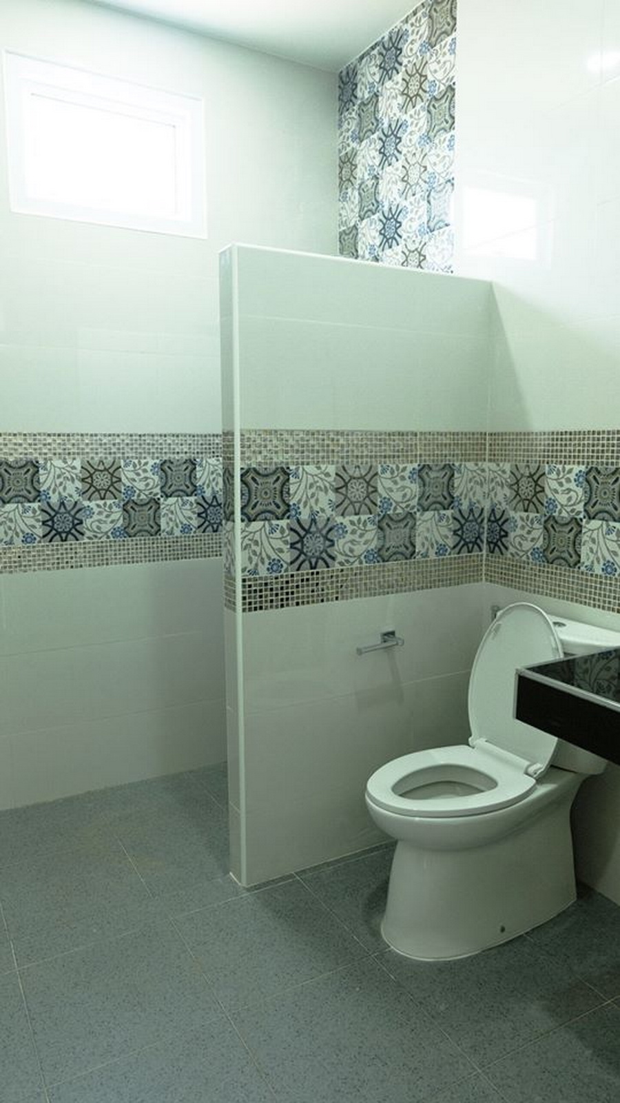ส่วนห้องน้ำ ตกแต่งด้วยประเบื้องโทนสีเขียว ให้ความเป็นธรรมชาติ ออกแบบอย่างเป็นสัดส่วนโดยมีกำแพงกั้นระหว่างพื้นที่แห้งและเปียก ใช้งานได้อย่างสะดวกสบาย