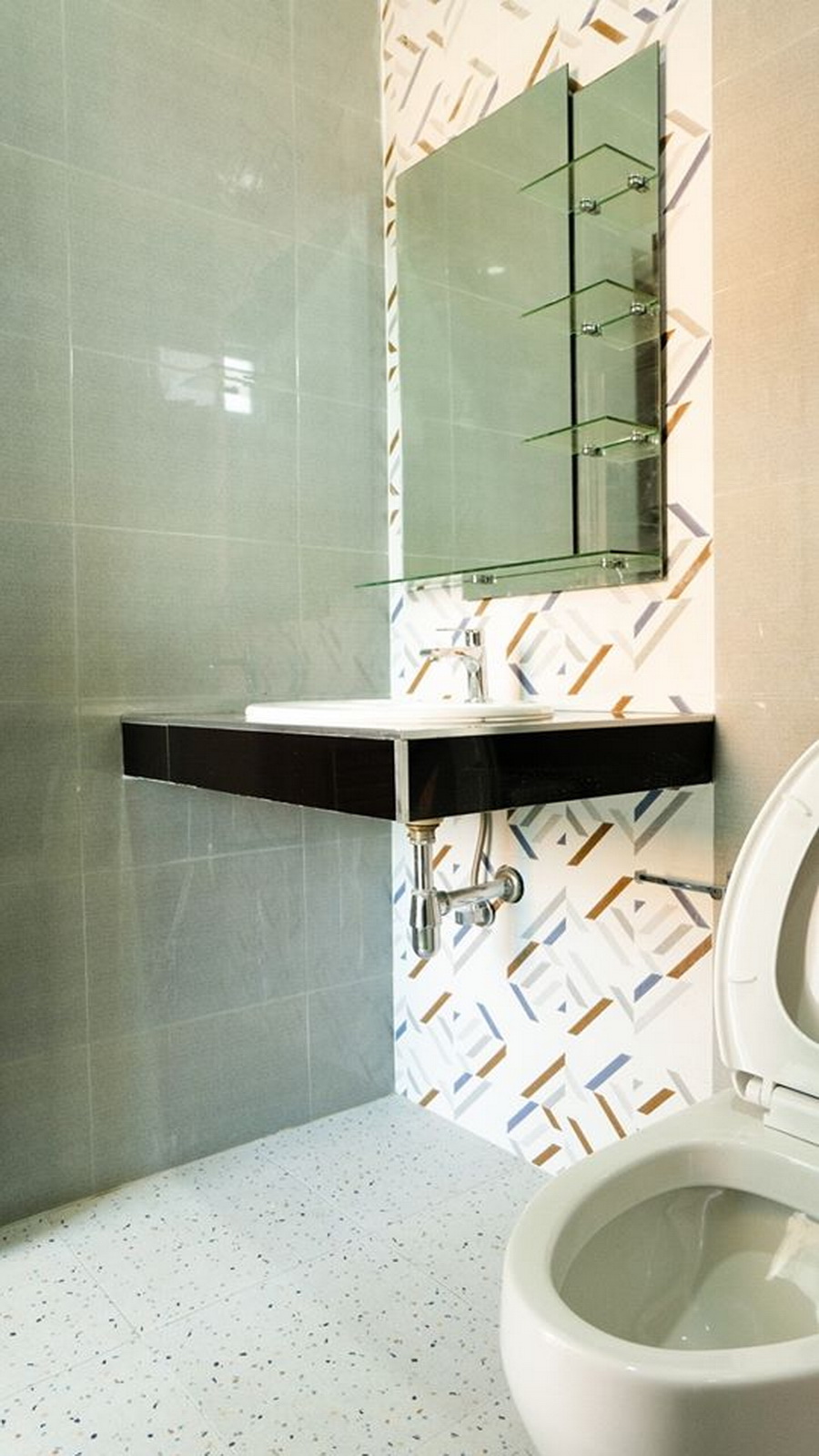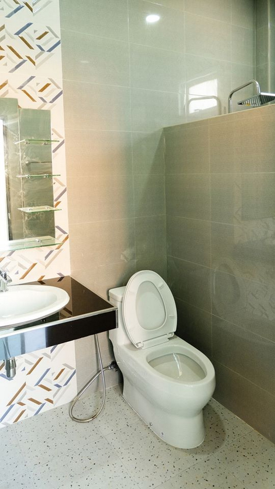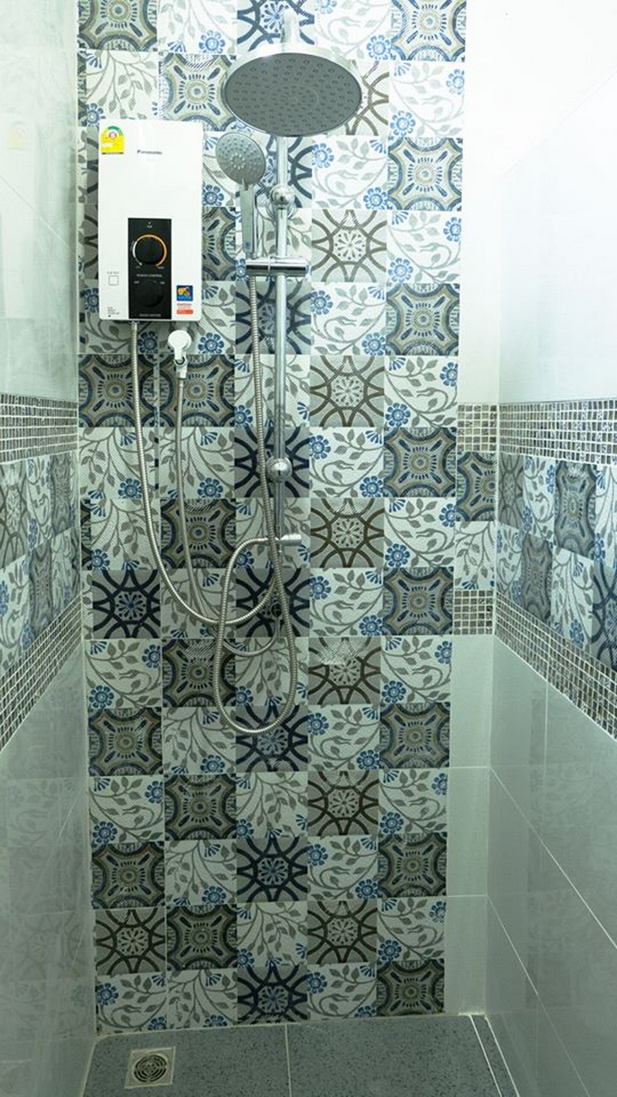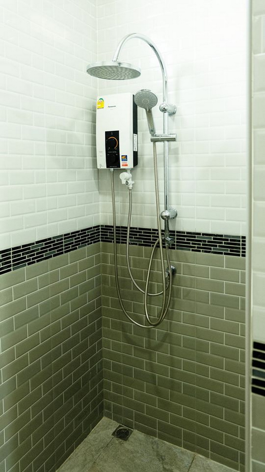 ส่วนห้องน้ำ ตกแต่งด้วยประเบื้องโทนสีเขียว ให้ความเป็นธรรมชาติ ออกแบบอย่างเป็นสัดส่วนโดยมีกำแพงกั้นระหว่างพื้นที่แห้งและเปียก ใช้งานได้อย่างสะดวกสบาย
