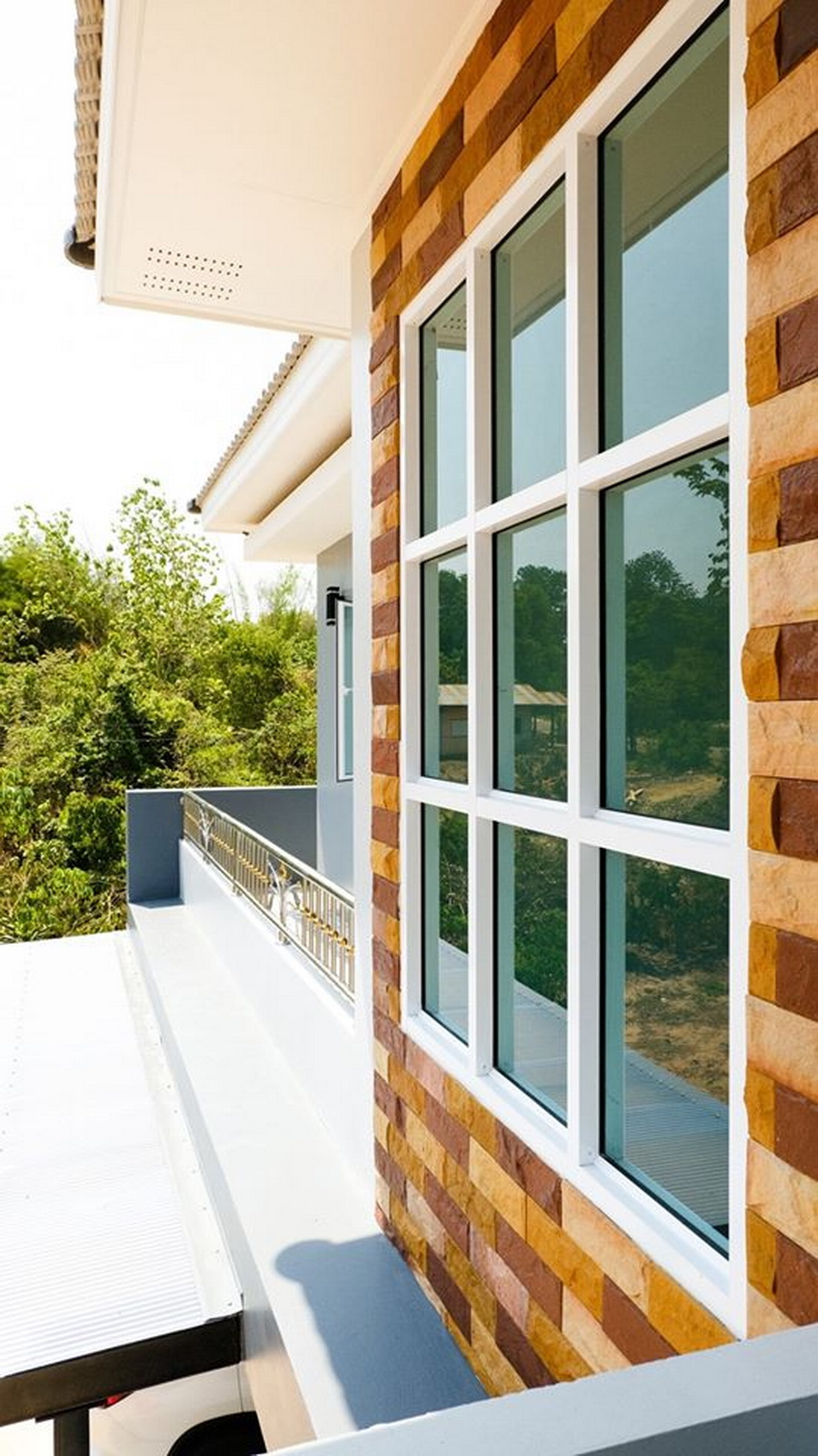 บ้านหลังนี้ถูกออกแบบในสไตล์ร่วมสมัย (คอนเทมโพรารี) หลังคาทรงปั้นหยา ผนังภายนอกทาด้วยสีเทา แทรกรายละเอียดด้วยหินทรายติดผนัง ทำให้บ้านหลังนี้โดดเด่น สะดุดตายิ่งขึ้น