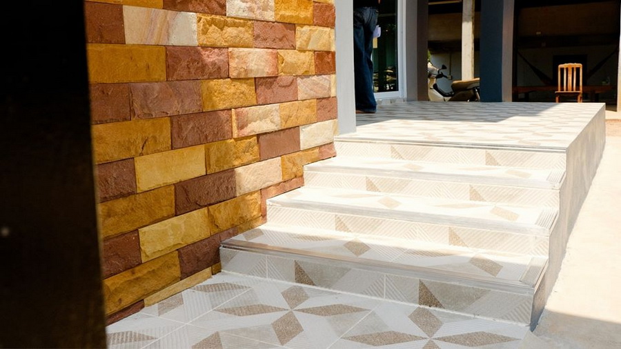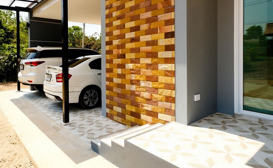 พื้นที่บริเวณชั้นหนึ่งแบ่งเป็นลานจอดรถในร่ม มีบันไดเล็กๆ นำสู่เฉลียงหน้าบ้าน ให้ความรู้สึกเชื่อมต่อกันโดยไม่ติดขัด ถัดจากเฉลียงเป็นประตูกระจกบานเลื่อนใส เปิดสู่ห้องโถงกว้างด้านใน