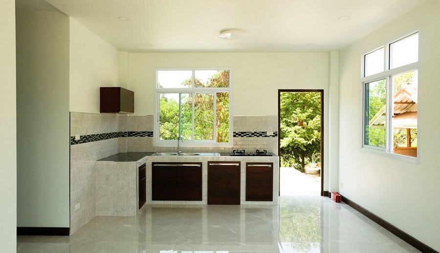 ถัดจากนั้นเป็นห้องครัว ซึ่งตั้งอยู่ทางด้านหลัง ตกแต่งในโทนสีเดียวกันกับห้องโถง ภายในประกอบไปด้วยเคาน์เตอร์บาร์ยาวรูปตัวแอล (L-Shape) สำหรับเตรียมอาหาร พร้อมหน้าต่างบานใหญ่ ป้องกันกลิ่นฟุ้งกระจายภายในห้อง