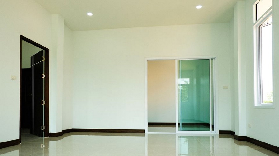 ภายในห้องนอนตกแต่งในโทนสีขาว พร้อมหน้าต่างเปิดรับแสงแดดจากธรรมชาติ ทำให้บรรยากาศภายในห้องดูผ่อนคลาย เหมาะกับการใช้เวลาพักผ่อนมายิ่งขึ้น