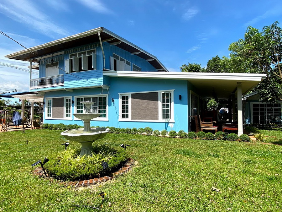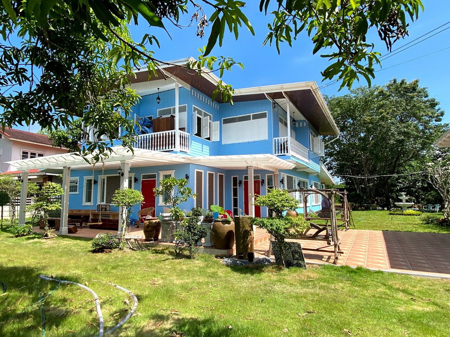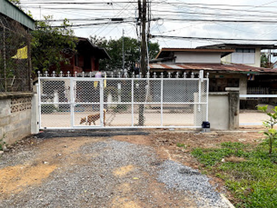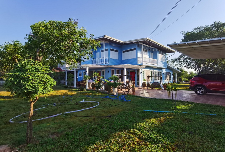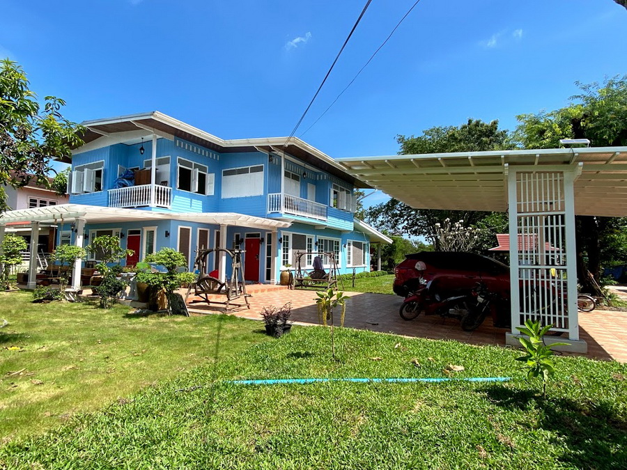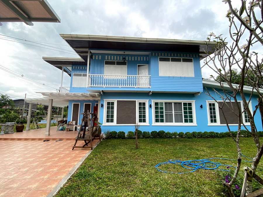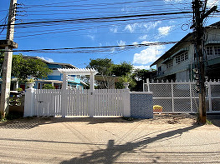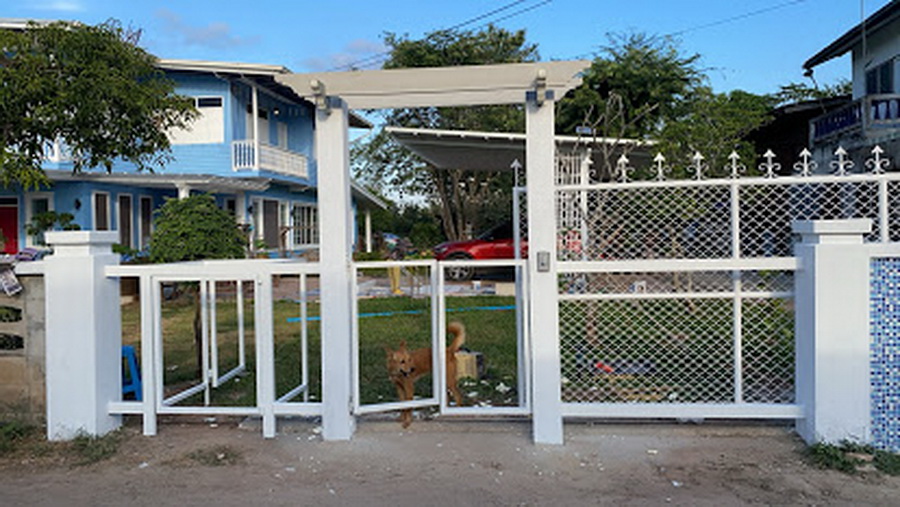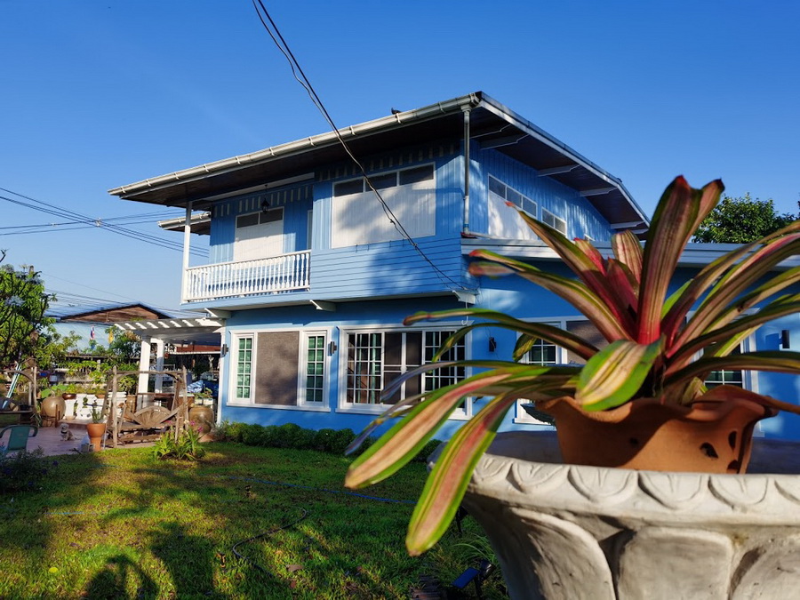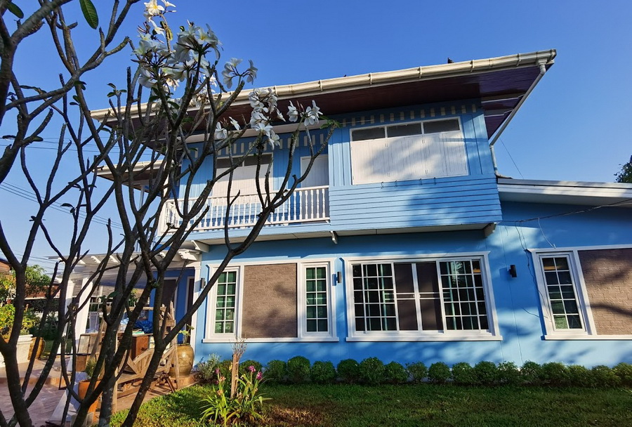 ธีมบ้านภายนอกสีฟ้าเป็นสีที่เล่นยากมาก ต้องเล่นกับขาวถึงจะหวาน โรงจอดรถก็ทำแบบโปร่งๆให้มีเสาแค่สองด้านแล้วก็ทำระแนงสีขาวให้ดูหวานๆ รั้วเก่าปลูกต้นตีนตุ๊กแกให้มันไต่เป็นรั้วธรรมชาติไป ที่ดินส่วนที่เป็นทางเข้าร่วมกับกับพี่น้องก็ทำประตูใหญ่และใส่รีโมทแล้วก็เอาประตูเหล็กเก่ามาทาสีขาวให้ดูสดใส