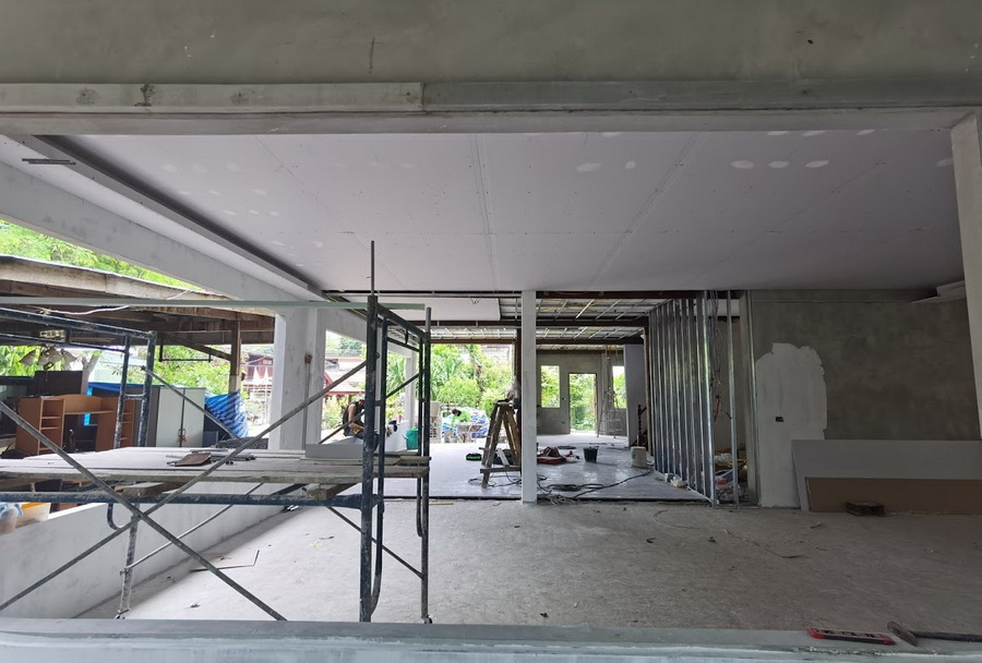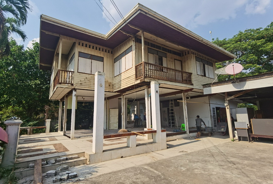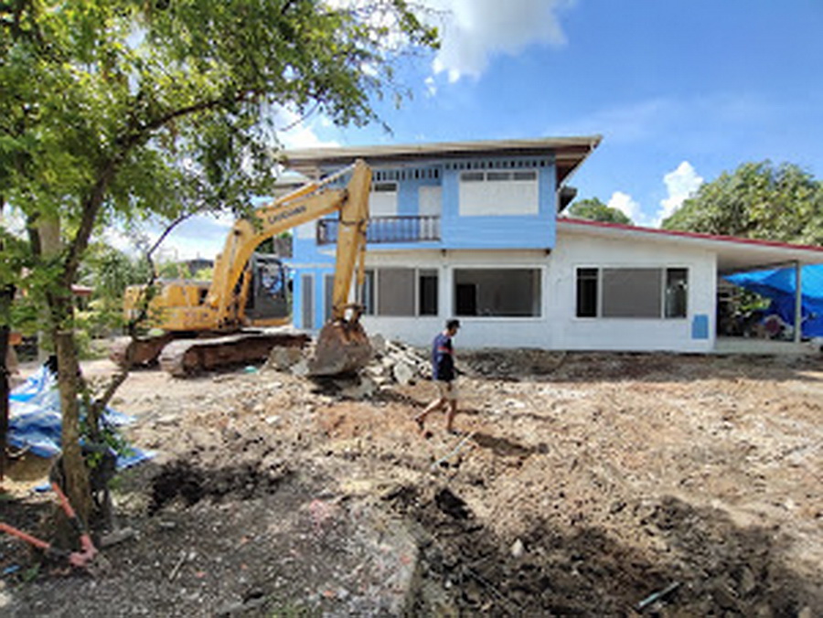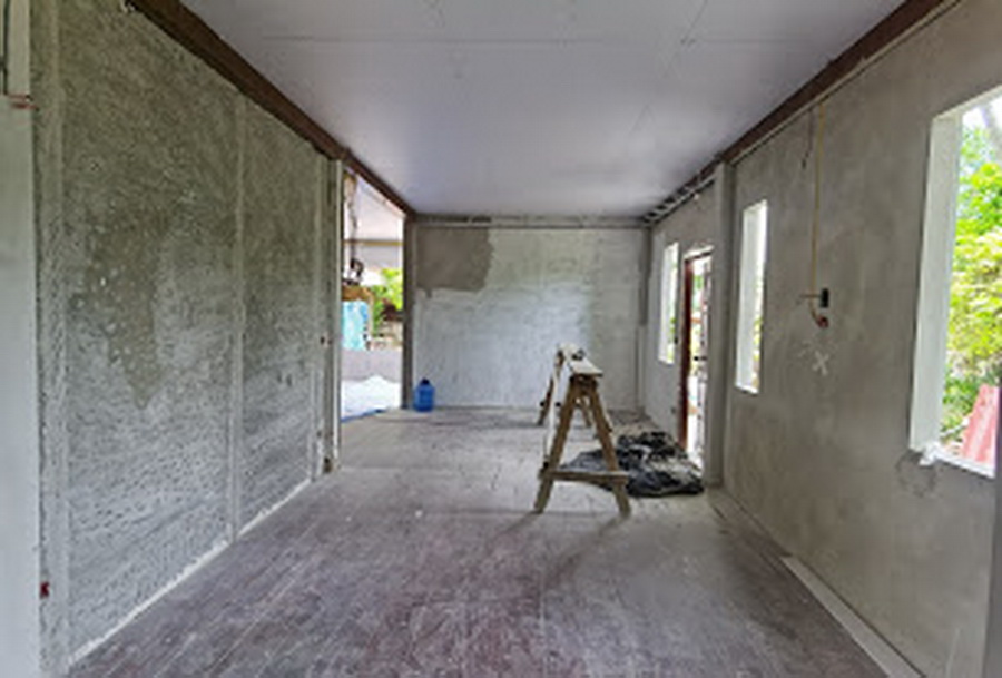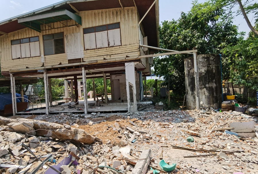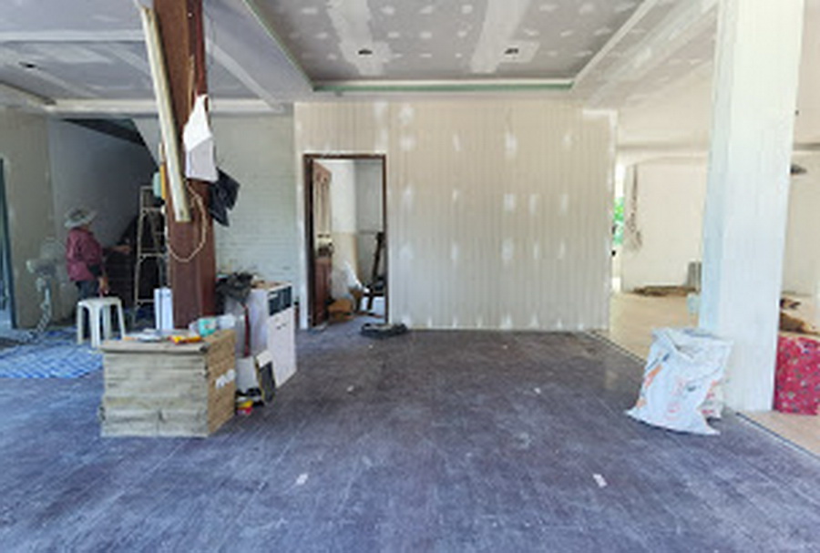 ทุบผนังชั้นล่างหมดและก่อสร้างลงเสาเข็มส่วนด้านหลังที่จะทำเป็นครัวและห้องนั่งเล่น ทำใหม่เหมือนสร้างบ้านใหม่เลย
