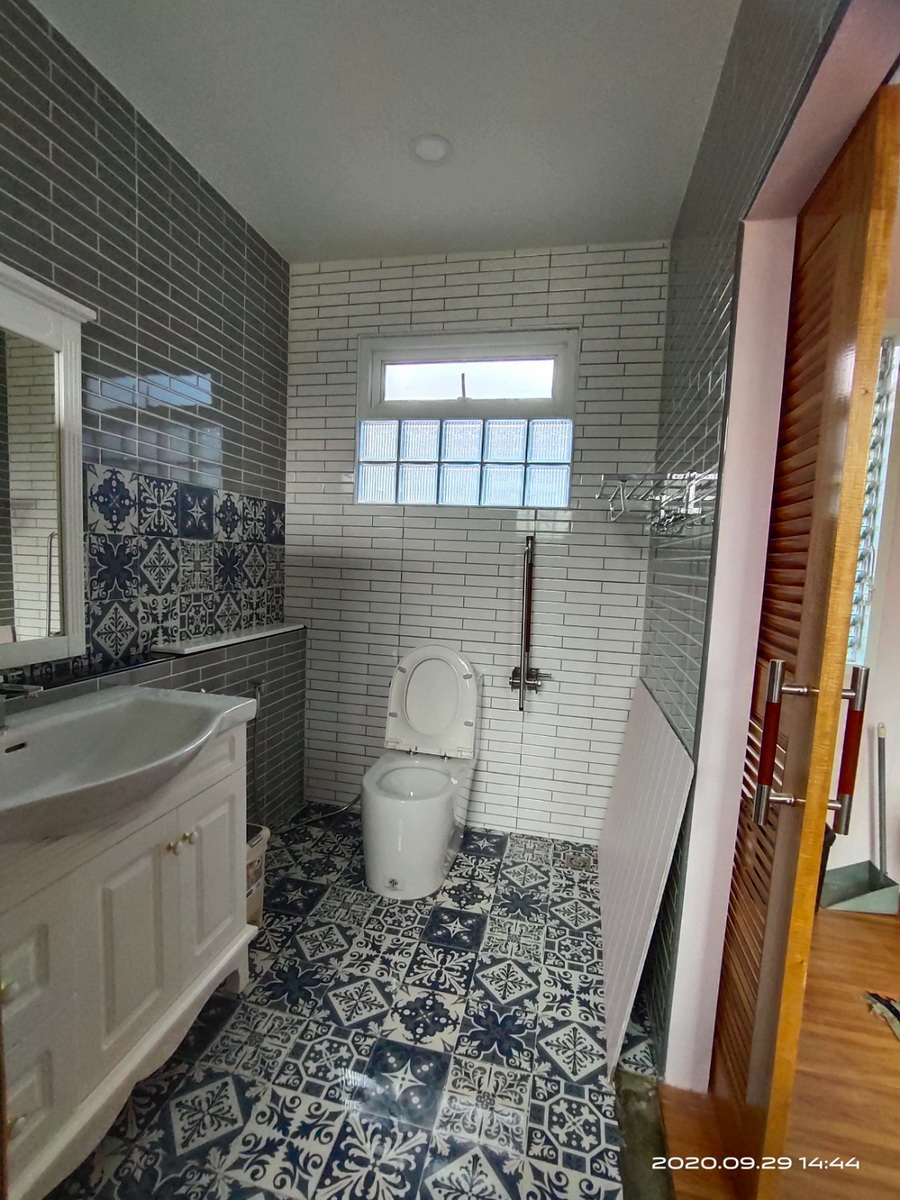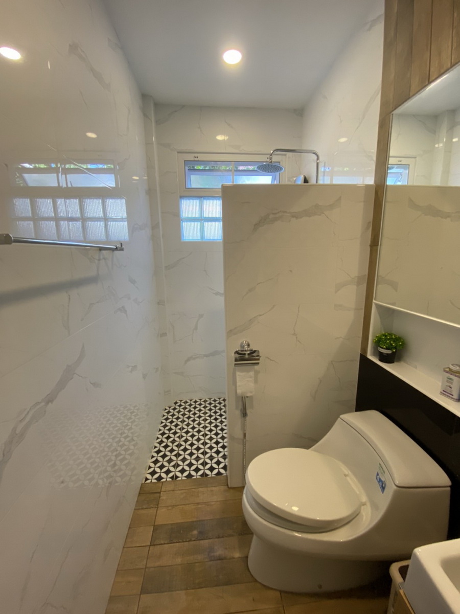 ห้องน้ำแม่ก็จะแบ่งเป็นโซนเปียกโซนแห้งและที่นั่งอาบน้ำ โถส้วมก็มีราวจับไว้พยุงตัวตอนลุกนั่ง