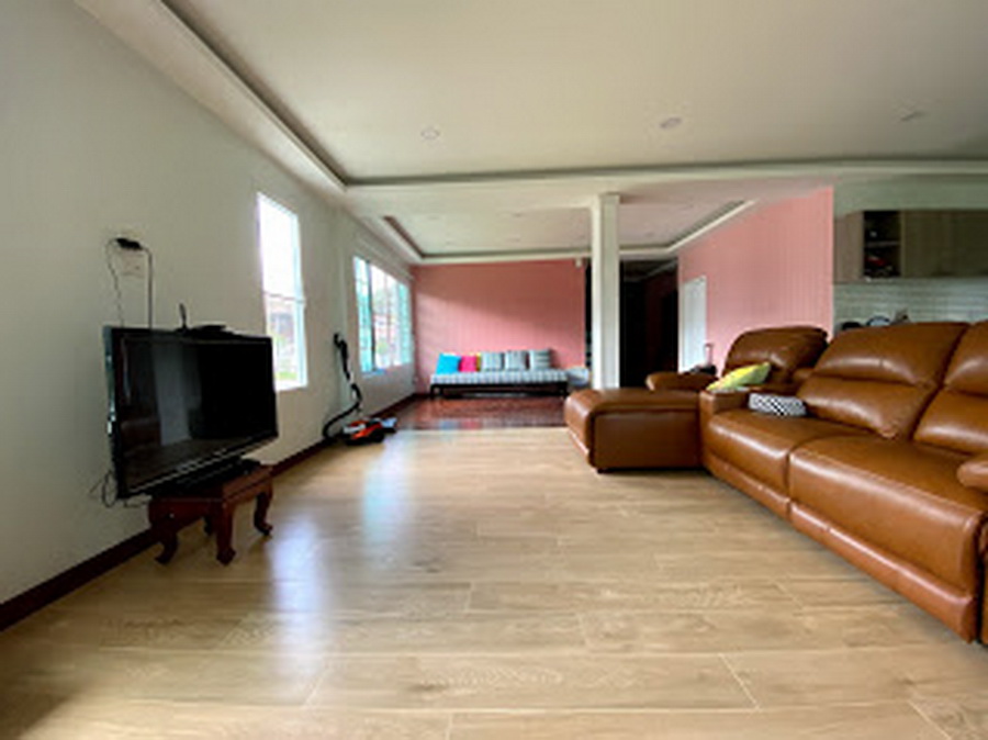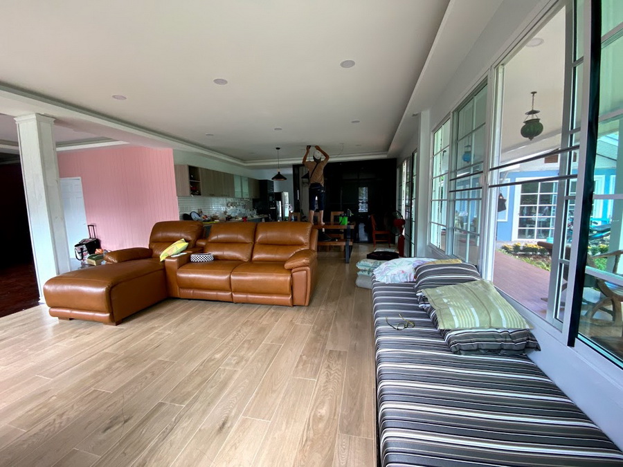 โถงในส่วนตัวบ้านเก่าพื้นเป็นไม้มะค่ายังสภาพดีอยู่ปลวกไม่กินและส่วนห้องนั่งเล่นและครัวที่ทำใหม่ปูกระเบื้องของ cotto แบบลายไม้ เชื่อมต่อเป็นโถงใหญ่โปร่งๆ แล้วทำครัวบิ้วอินของบุญถาวร เตาแก๊สและที่ดูดควันของ osama ดูดแรงเหมาะกับการทำอาหารครัวไทยในบ้านยิ่งนัก