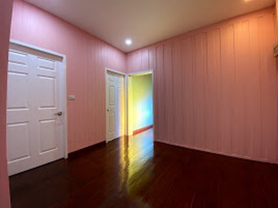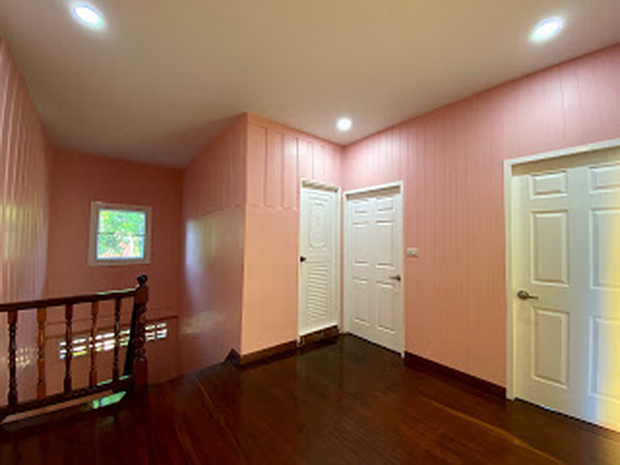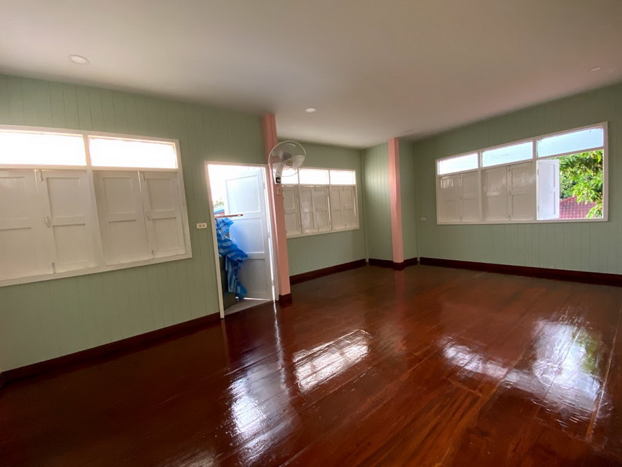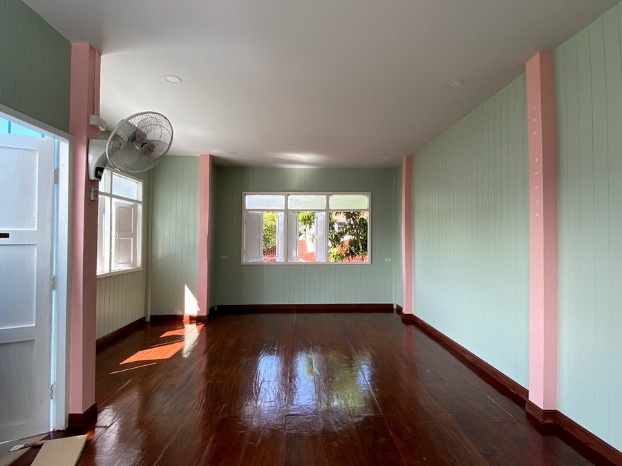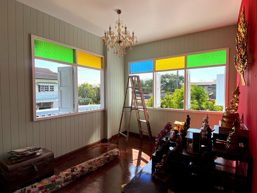 ส่วนชั้นบนก็รื้อเหล็กดัดมุ้งลวดเดิมออกหมดแล้วก็ทาสีบุผนังใหม่ไม่เอาช่องลมไว้เพราะเป็นที่ทำให้ฝุ่นเข้ามาบ้าน ทำให้เหนื่อยในการทำความสะอาด เปลี่ยนประตูห้องนอน หน้าต่างคงไว้เหมือนเดิมเปลี่ยนกระจกฝ้ามาเป็นกระจกสีให้ดูบ้านวิเทจยิ่งขึ้น ทาสีภายในสีพาสเทลหวานๆให้บ้านเก่าจะได้ดูสดใส สีหวานมาก