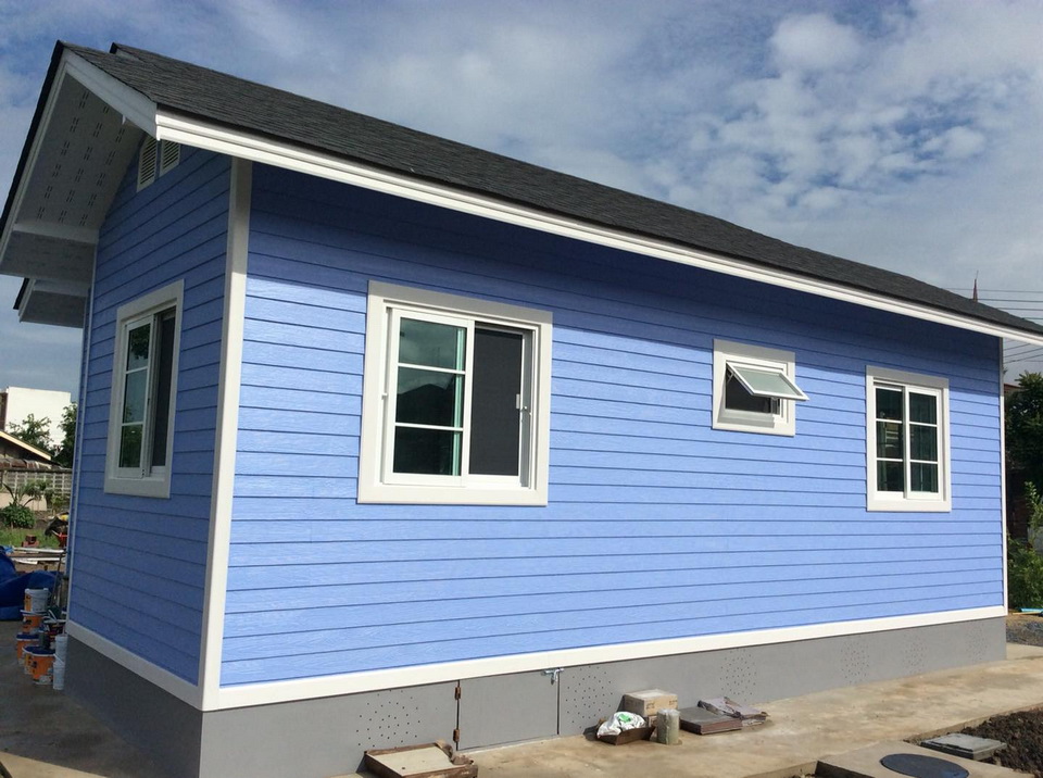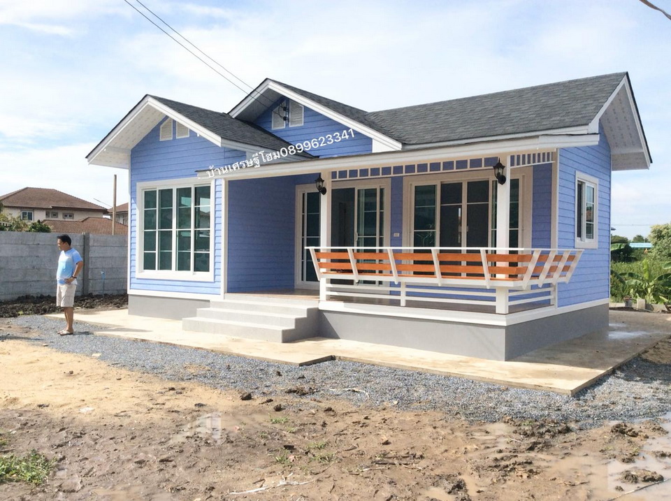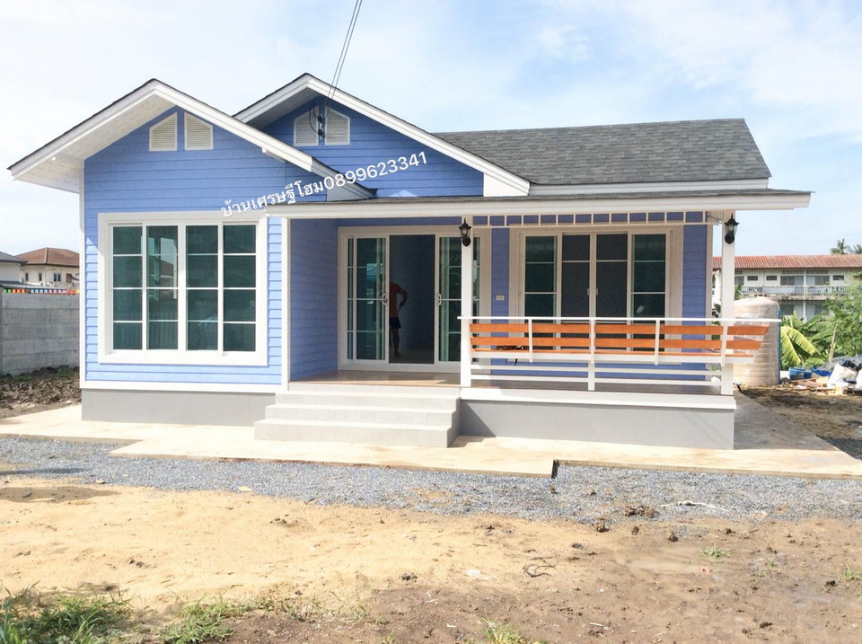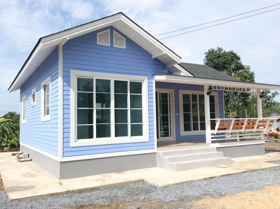 ตัวบ้านชั้นเดียวโครงสร้างเหล็กน็อคดาวน์ ผนังภายนอกตกแต่งด้วยไม้โทนสีฟ้า ตัดกับเชิงชายหลังคารวมไปถึงวงกบประตูหน้าต่างโทนสีขาว หลังคาทรงตจั่วมุงด้วยกระเบื้องโทนสีเทา