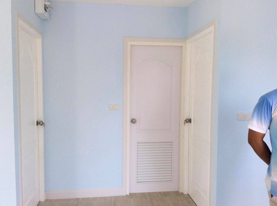 เข้ามาชมบรรยากาศภายในกันเลย ตกแต่งผนังด้วยโทนสีฟ้า ปูพื้นด้วยกระเบื้องลายไม้ธรรมชาติ ส่วนฝ้าเพดานเดือนใช้โทนสีขาวโดยมีการเล่นระดับฝ้าหลุมบางส่วน