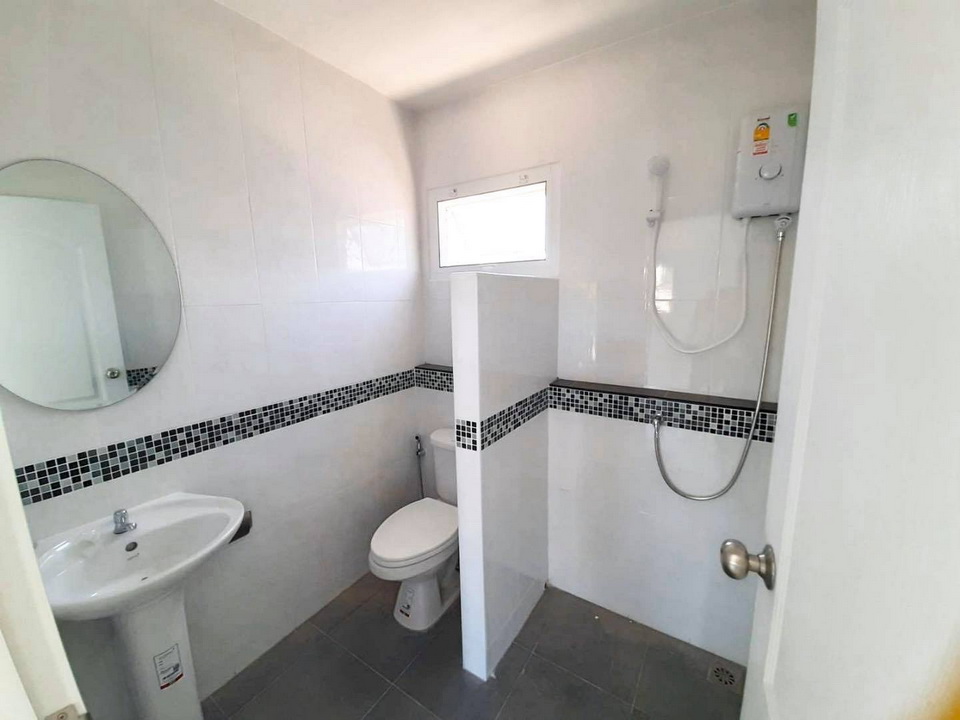 ห้องน้ำมีขนาดกะทัดรัด แต่จัดสรรพื้นที่ใช้สอยอย่างเป็นสัดส่วน แบ่งพื้นที่อาบน้ำด้วยพาร์ทิชันเล็ก ๆ ตกแต่งผนังในโทนสีขาวแทรกด้วยกระเบื้องลายกราฟิกโทนสีดำ ปูพื้นด้วยกระเบื้องโทนสีเทาเข้ม