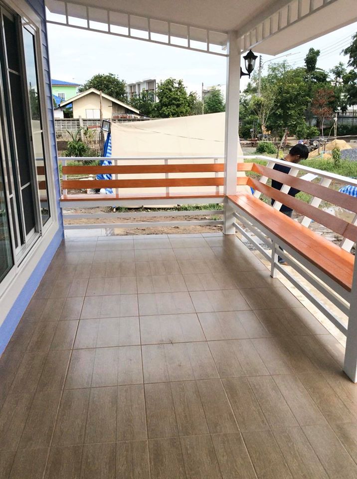 พื้นระเบียงหน้าบ้านปูด้วยกระเบื้องลายไม้สีน้ำตาล เหมาะสำหรับรับแขก พูดคุย นั่งเล่นรับลม ให้บรรยากาศการต้อนรับที่อบอุ่นเป็นกันเองสุด ๆ