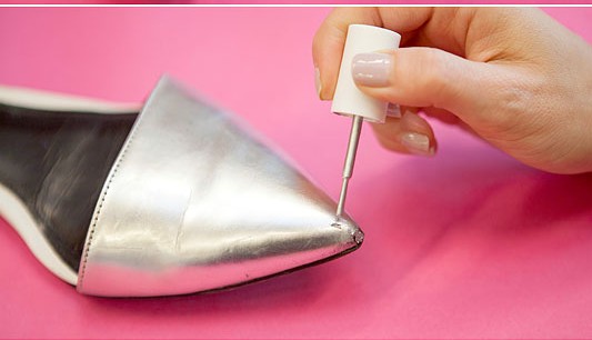 รองเท้าผู้หญิงที่มีรอยเล็กๆ ดูไม่สวยงาม แก้ปัญหาง่ายๆด้วยการใช้สีทาเล็บสีเดียวกันกับรองเท้า ทาปกปิดบริเวณที่เป็นรอยถลอก ข้อสำคัญคือต้องเลือกสีที่ใกล้เคียงที่สุด มิฉะนั้นรองเท้าของคุณอาจจะเละเทะยิ่งกว่าเดิม