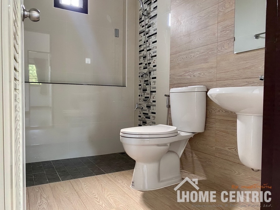 ห้องน้ำตกแต่งด้วยสีเอิร์ทโทน พื้นและผนังบางส่วนปูด้วยกระเบื้องลายไม้ ให้ความสวยงาม เป็นธรรมชาติ มีการแบ่งสัดส่วนพื้นที่แห้งและเปียก พร้อมเจาะผนัง ไว้สำหรับวางของ ทำให้มีสเปซสำหรับการใช้งานมากขึ้น