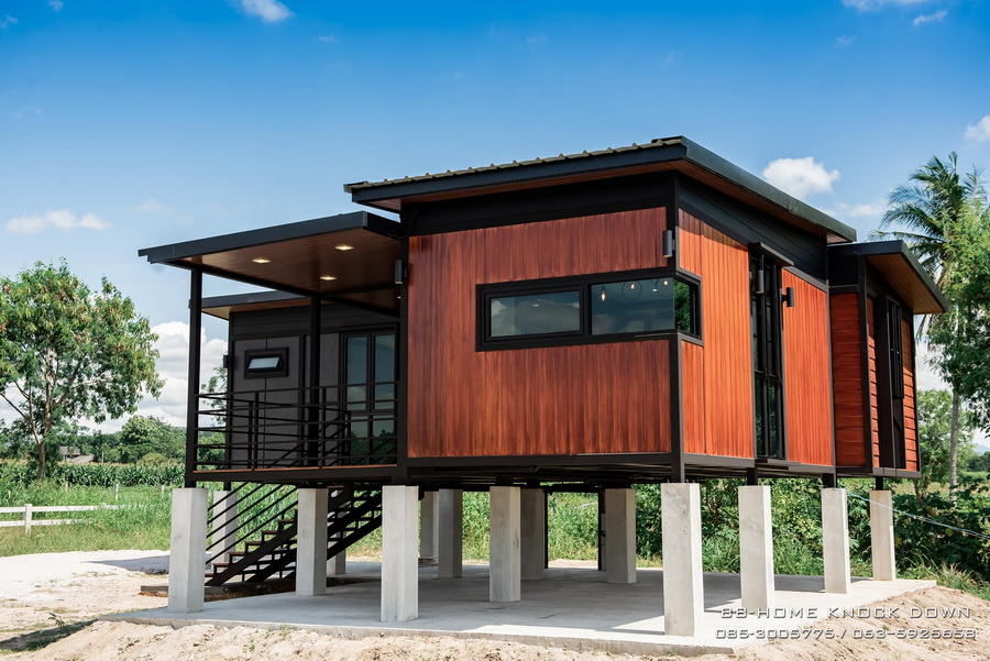 แม้ตัวบ้านจะเป็นแบบน็อคดาวน์ แต่ในส่วนของฐานและเสาเอกสร้างขึ้นในแบบเทพื้นคอนกรีต จึงให้ความั่นคงแข็งแรงเหมือนบ้านที่สร้างทั่วไป นอกจากนี้การยกใต้ถุนสูงแบบนี้ จะทำให้มีพื้นที่ใช้สอยแบบโปร่งโล่ง เหมาะกับบรรยากาศบ้านสวนอีกด้วย