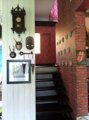 เลยทำผนังกันบันไดให้เวลาเดินไม่เขินคนที่นั่งทานอาหารอยู่ และเค้าบอกว่าบันไดกับประตูไม่ควรตรงกันเลยกั้นบังส่วนที่ตรงกันไว้ แล้วก็ติดวอลล์เปเปอร์เป็นลายอิฐให้อารมณ์อบอุ่น