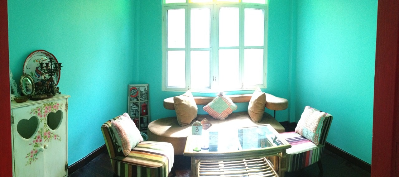 ห้องด้านซ้าย จริง ๆ โคมไฟห้องนี้สวยมากแต่ถ่ายแล้วไม่เห็น ห้องนี้จะเด่นที่โคมไฟน่ารัก ๆ วินเทจกับโซฟาสบาย ๆ