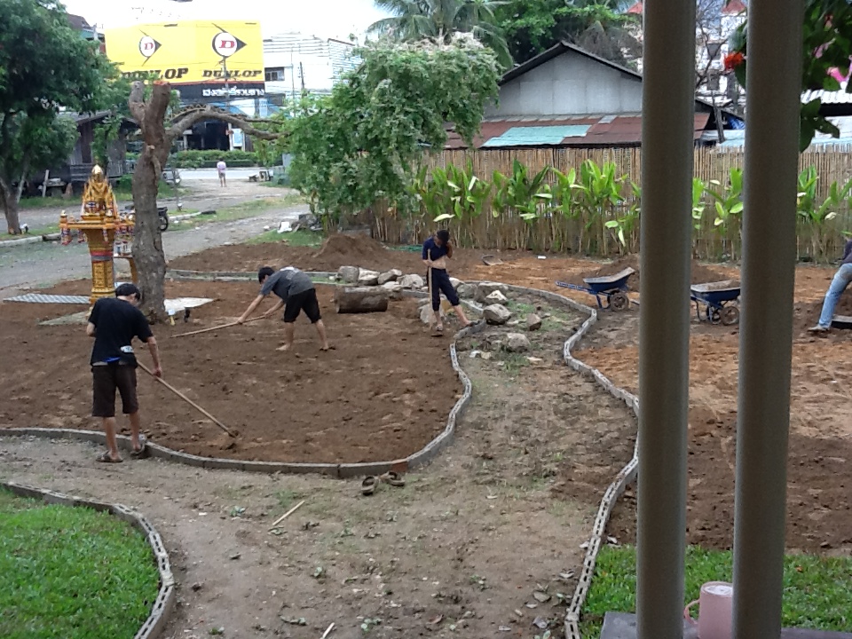 แล้วเทหินกรวดเม็ดเล็กลงไปก็จะได้ทางเดิน หินจะไม่ไหลออกเวลาหน้าฝนหรือรดน้ำต้นไม้ด้วย