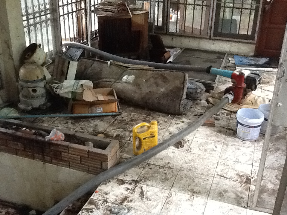 วันนี้สูบได้เมตรนึงเครื่องสูบน้ำไหม้ พอกลับมาสูบต่อพรุ่งนี้น้ำก็ขึ้นมาเท่าเดิมแล้ว สุดท้ายเลยต้องจ้างคนมาลุยน้ำขนขยะออกมาแล้วเทปูนทับลงไปเลยประมาณ 10 ซม.