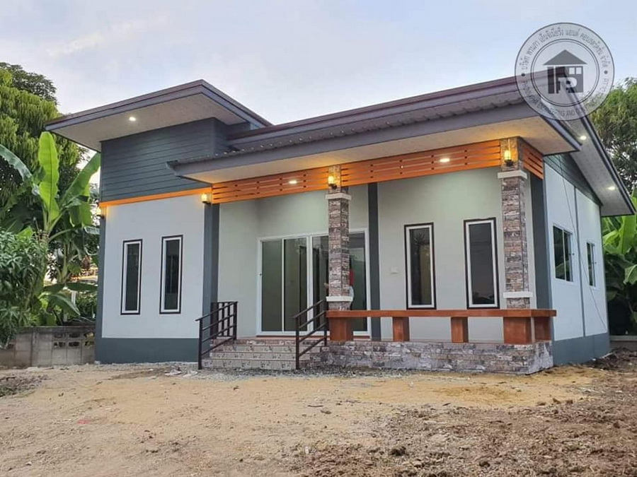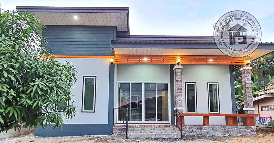 บ้านหลังนี้เป็นบ้านสไตล์โมเดิร์นชั้นเดียว ออกแบบหน้ากว้าง ตัวบ้านมีรูปทรงที่เรียบง่าย ซึ่งรับกับหลังคาทรงเพิงหมาแหงนแบบลาดเอียงเป็นสโลป ด้านการตกแต่งนั้น ผนังภายนอกเลือกใช้โทนสีเทาอ่อนยืนพื้น เล่นส่วนขอบต่าง ๆ ด้วยสีเทาเข้มและสีน้ำตาล