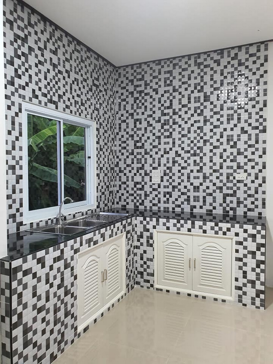 สำหรับห้องครัวนั้น ภายในโดดเด่นด้วยการตกแต่งด้วยกระเบื้องโมเสกสีขาว-ดำ พร้อมกับติดตั้งด้วยเคาน์เตอร์ครัวแบบติดผนังที่ช่วยอำนวยความสะดวกได้เป็นอย่างดี
