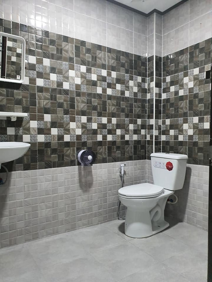 เช่นเดียวกันกับห้องน้ำที่ภายในตกแต่งด้วยกระเบื้องที่มีลวดลายแบบโมเสกหลากหลายสีสันและลวดลาย ภายในห้องมีชุดสุขภัณฑ์ที่ครบทุกฟังก์ชันการใช้งาน