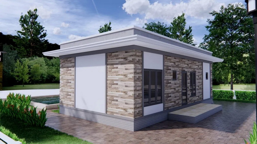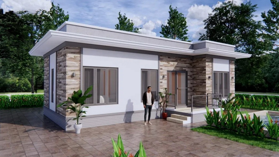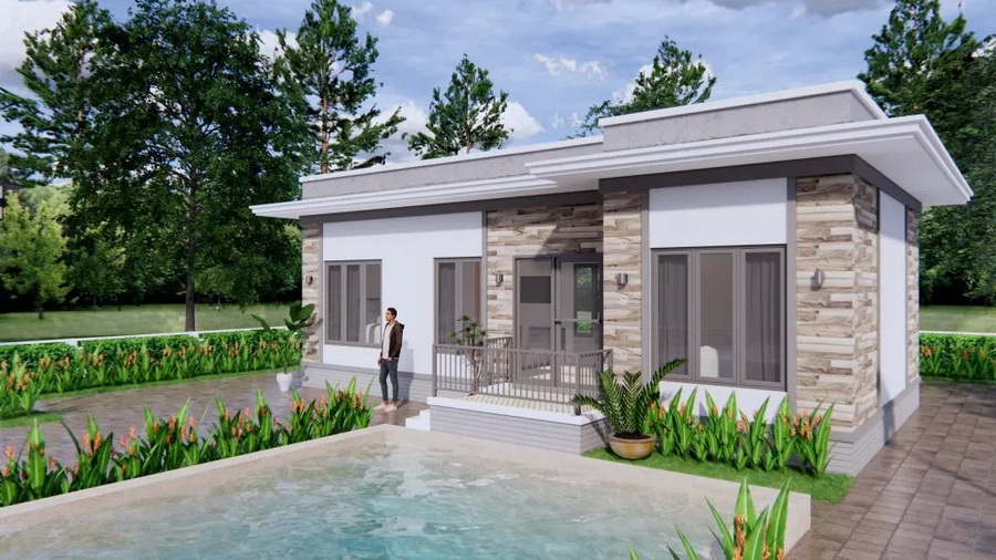 สำหรับบ้านหลังเล็กหลังนี้เป็นบ้านขนาดชั้นเดียวหน้ากว้าง ตัวบ้านเป็นทรงกล่องเรียบง่ายในแบบโมเดิร์น ส่วนของหลังคาก็เป็นแบบเรียบ ผนังภายนอกตกแต่งในโทนสีขาวยืนพื้น แซมด้วยกระเบื้องลายหินธรรมชาติเพื่อความโดดเด่นให้กับตัวบ้าน