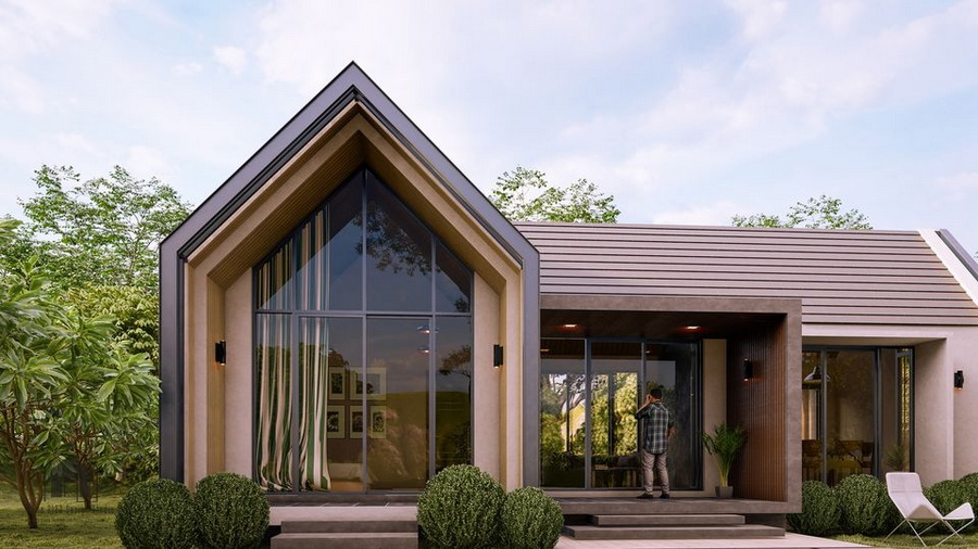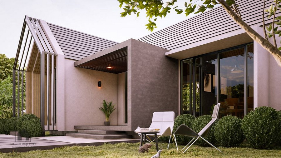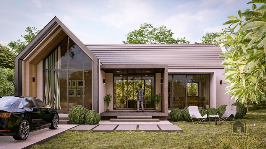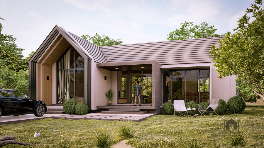 สำหรับแบบบ้านหลังนี้เป็นบ้านชั้นเดียวลักษณะหน้ากว้าง ตัวบ้านมีรูปทรงแบบโมเดิร์น ผสานไปกับการตกแต่งที่มีความเรียบง่ายในแบบมินิมอล ซึ่งโดดเด่นด้วยหลังคาทรงหน้าจั่วที่มุงด้วยกระเบื้องแบบเรียบ ผนังภายนอกใช้โทนสีอ่อน จึงให้บรรยากาศที่อ่อนโยนน่าอยู่