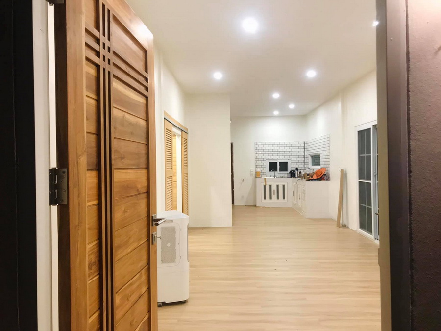 บานประตูจะเป็นบานประตูไม้โทนสีน้ำตาล ซึ่งเข้ากันดีกับผนังสีขาวของบ้าน นอกจากนี้ อีกหนึ่งความโดดเด่นจะอยู่ที่งานหลังคาที่เป็นทรงหน้าจั่ว จึงเหมาะกับสภาพอากาศของเมืองไทย