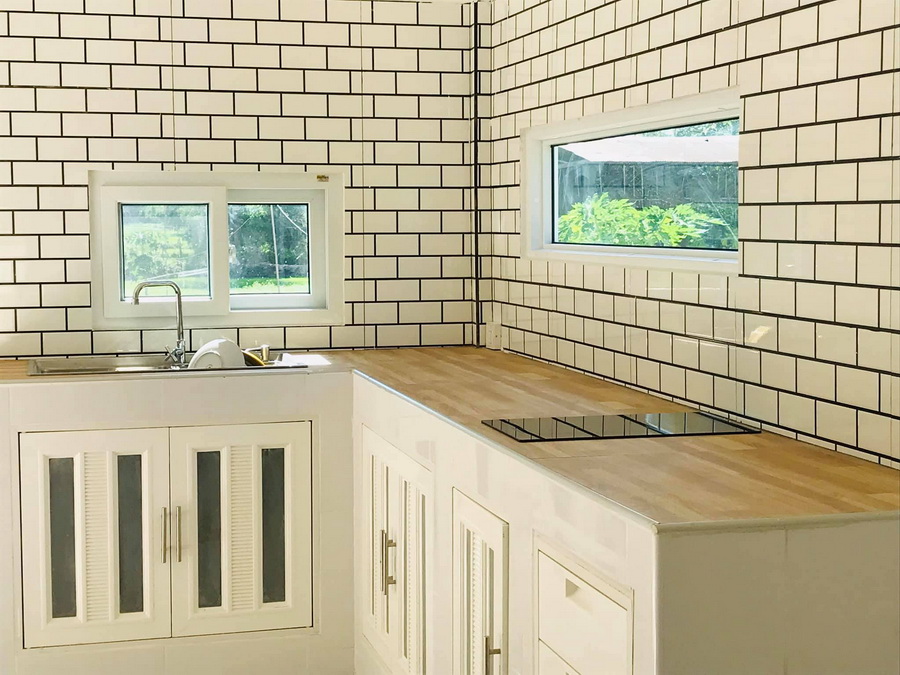 บริเวณพื้นที่ครัวถูกติดตั้งด้วยเคาน์เตอร์ครัวแบบติดผนังรูปตัวแอล ผนังครัวติดกระเบื้องลายอิฐสีขาว หน้าต่างบริเวณครัวจะเลือกใช้แบบบานเลื่อนขนาดเล็ก