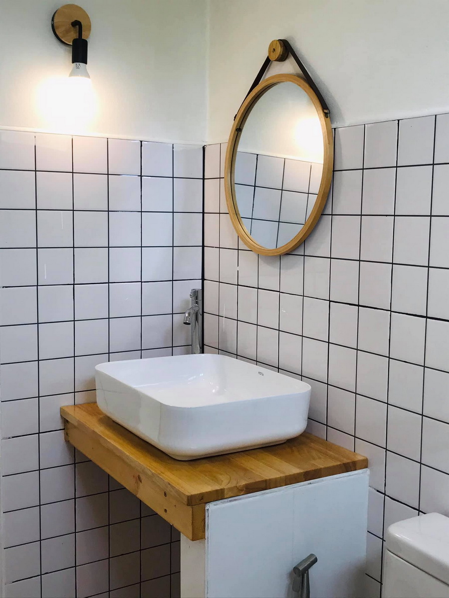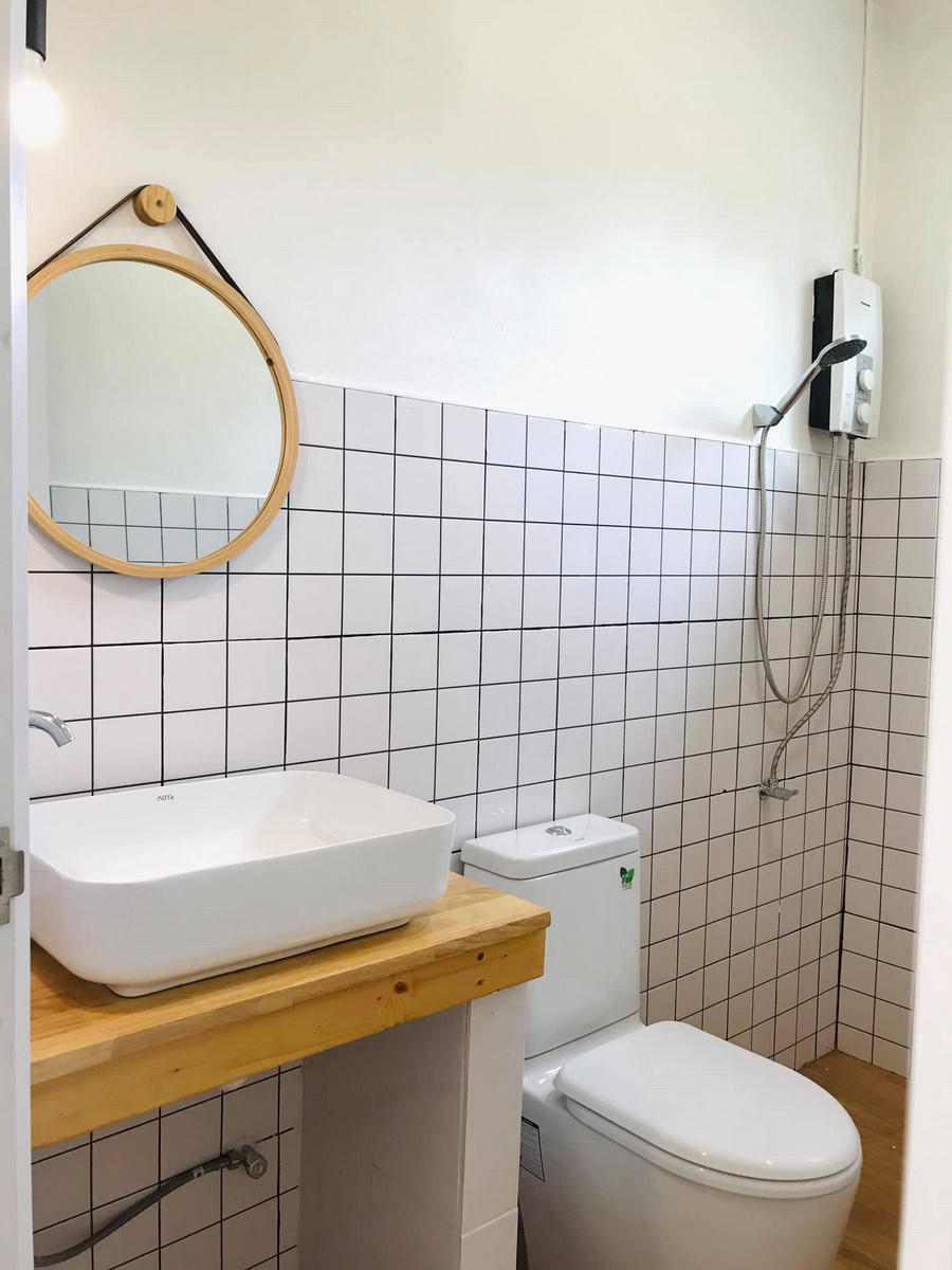 ภายในห้องน้ำ เป็นอีกห้องที่ยังคงมีธีมมินิมอลที่อบอุ่น ผนังติดกระเบื้องสี่เหลี่ยมสีขาว โดยมีฟังก์ชันการใช้งานที่ครบถ้วน สะดวกทุกการใช้งาน