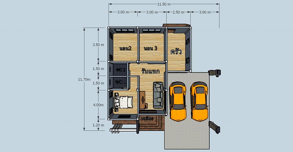 แบบบ้านชั้นเดียวหน้ากว้าง ดีไซน์สไตล์โมเดิร์น 3 ห้องนอน 2 ห้องน้ำ พื้นที่ประมาณ 80 ตร.ม.