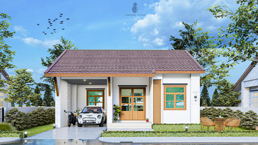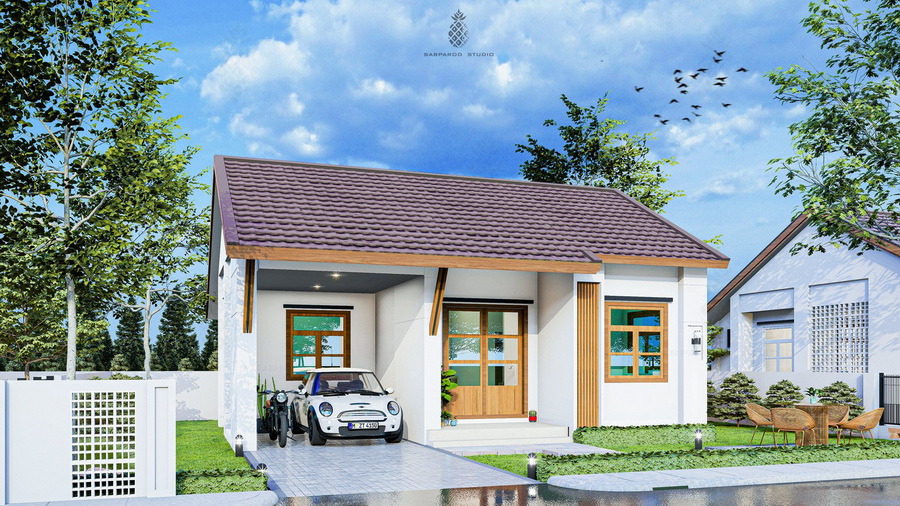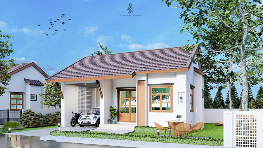 บ้านชั้นเดียวสไตล์โมเดิร์น-มินิมอลหลังนี้ประกอบไปด้วย 3 ห้องนอน 2 ห้องน้ำ 1 รับแขก 1 ครัว 1 จอดรถ 1 จักรยานยนต์ พื้นที่ใช้สอยทั้งหมดประมาณ 80 ตารางเมตร งบก่อสร้างอยู่ที่ประมาณ 960,000 บาท