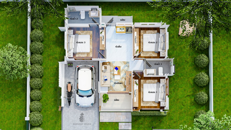 บ้านชั้นเดียวสไตล์โมเดิร์น-มินิมอล ผลงานการออกแบบโดย Sabparod Studio เป็นบ้านหน้ากว้างขนาดกลางที่มีดีไซน์ที่ทันสมัย ผสานไปกับแนวทางการตกแต่งที่เรียบง่ายในแบบมินิมอล เป็นบ้านที่มีพื้นที่ใช้สอยที่รองรับครอบครัวขนาดกลางได้อย่างเหมาะสม