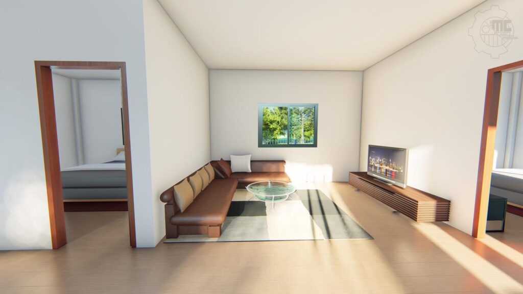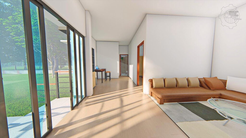 เข้ามาชมภายในกันเลย เมื่อเดินเข้ามาจะพบกับห้องโถงที่โล่งกว้าง จัดเป็นห้องนั่งเล่น/รับแขก ตกแต่งด้วยโซฟาทรงตัวแอล ชั้นวางทีวีไม้ พร้อมปูพรมสีน้ำตาล ซึ่งบริเวณนี้จะได้รับแสงสว่างผ่านประตูทางเข้าบานใหญ่อย่างเต็มที่