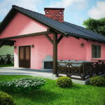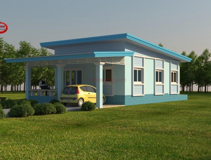 ตัวบ้านขนาดชั้นเดียว ผนังก่ออิฐมอญฉาบปูนเรียบ ทาสีฟ้าสดใส (สามารถเลือกเปลี่ยนสีได้) หลังคาเลือกใช้ทรงเพิงหมาแหงนตามแบบฉบับบ้านสไตล์โมเดิร์น มุงด้วยวัสดุเมทัลชีทหรือเหล็กรีดลอน สามารถเลือกได้ตามกำลังงบประมาณของเรา