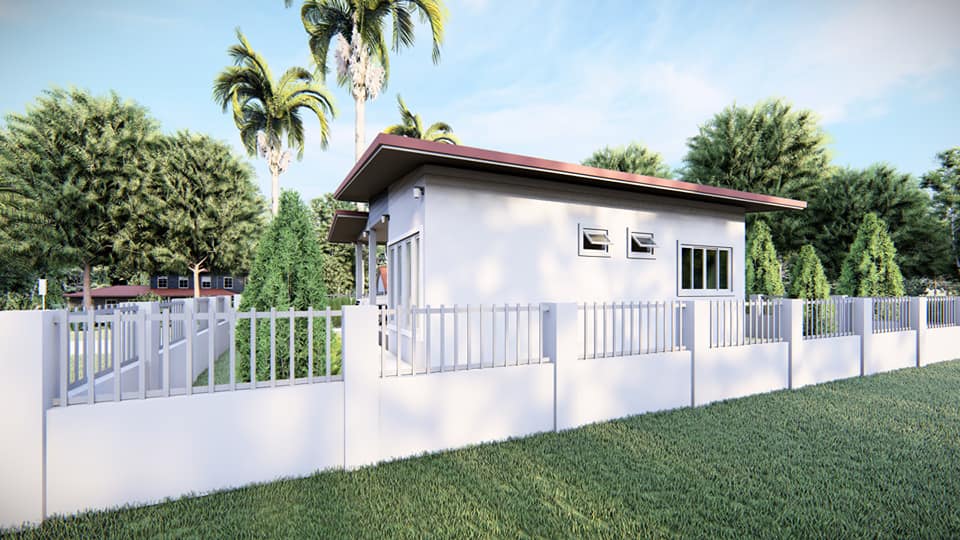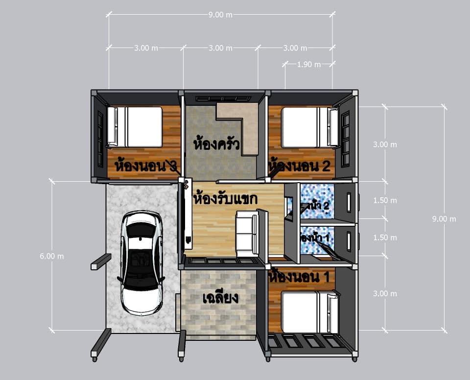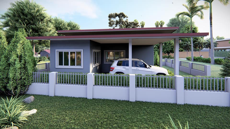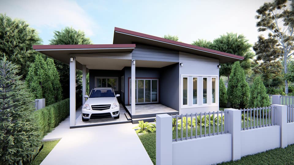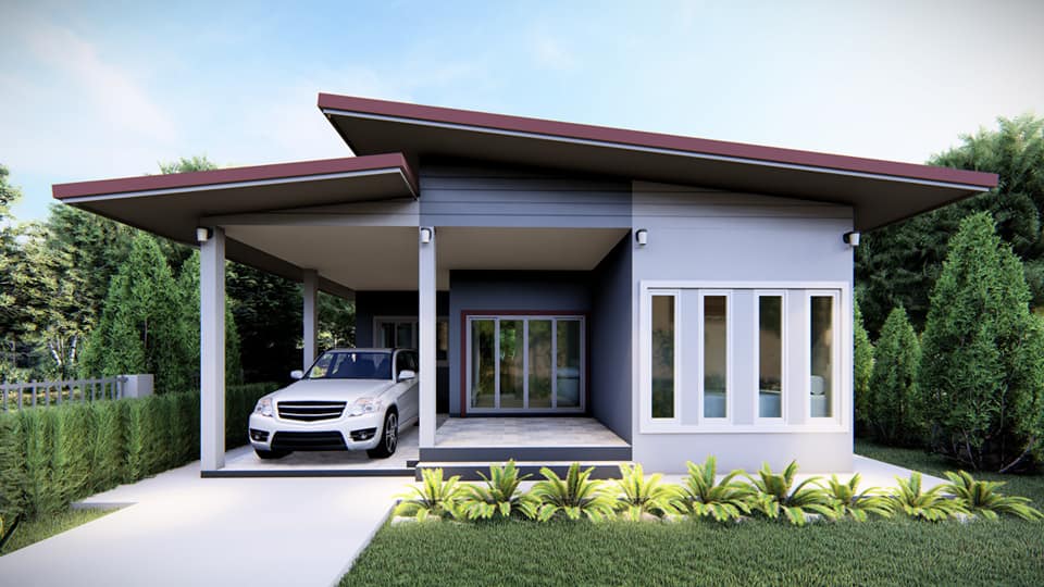 แบบบ้านทรงโมเดิร์น หลังคาทรงปีกนก ส่วนของการใช้งานครบครัน 3 ห้องนอน 2 ห้องน้ำ พื้นที่ 81 ตร.ม.