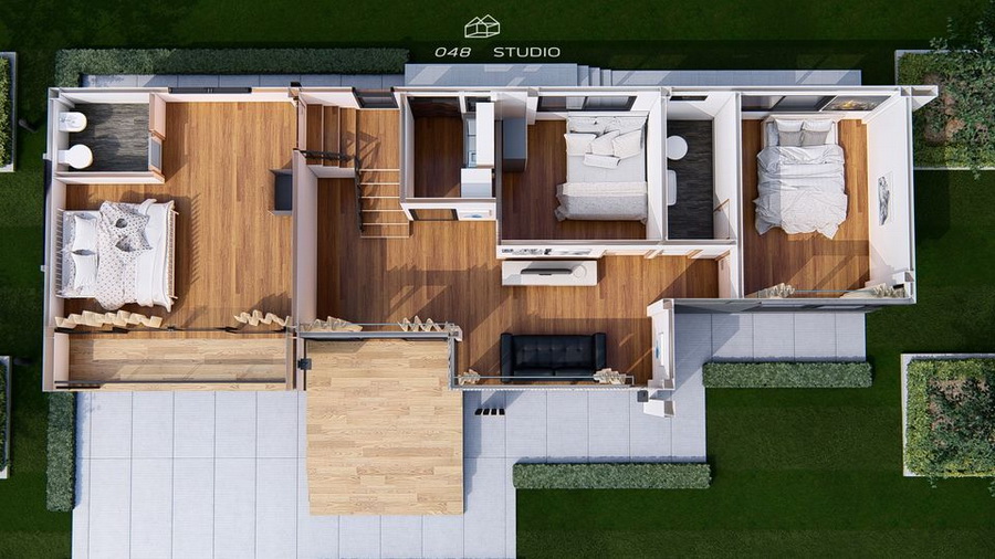 แบบบ้านชั้นครึ่งสไตล์โมเดิร์น พร้อมออกแบบใต้ถุนยกสูงเป็นที่จอดรถ 3 ห้องนอน 2 ห้องน้ำ พื้นที่ 82 ตร.ม.