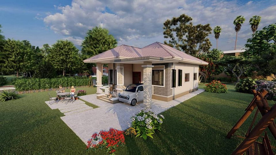 แบบบ้านหลังนี้เป็นบ้านชั้นเดียว ตัวบ้านเป็นบ้านขนาดกลางแบบหน้าแคบที่เน้นความยาว โครงสร้างของบ้านมีความแข็งแรงทันสมัย ออกแบบหลังคาด้วยทรงแบบปั้นหยาที่มุงด้วยกระเบื้องลอนขนาดเล็ก ด้านการตกแต่งนั้น ผนังภายนอกเลือกใช้โทนสีครีม จึงให้บรรยากาศที่อบอุ่นน่าอยู่