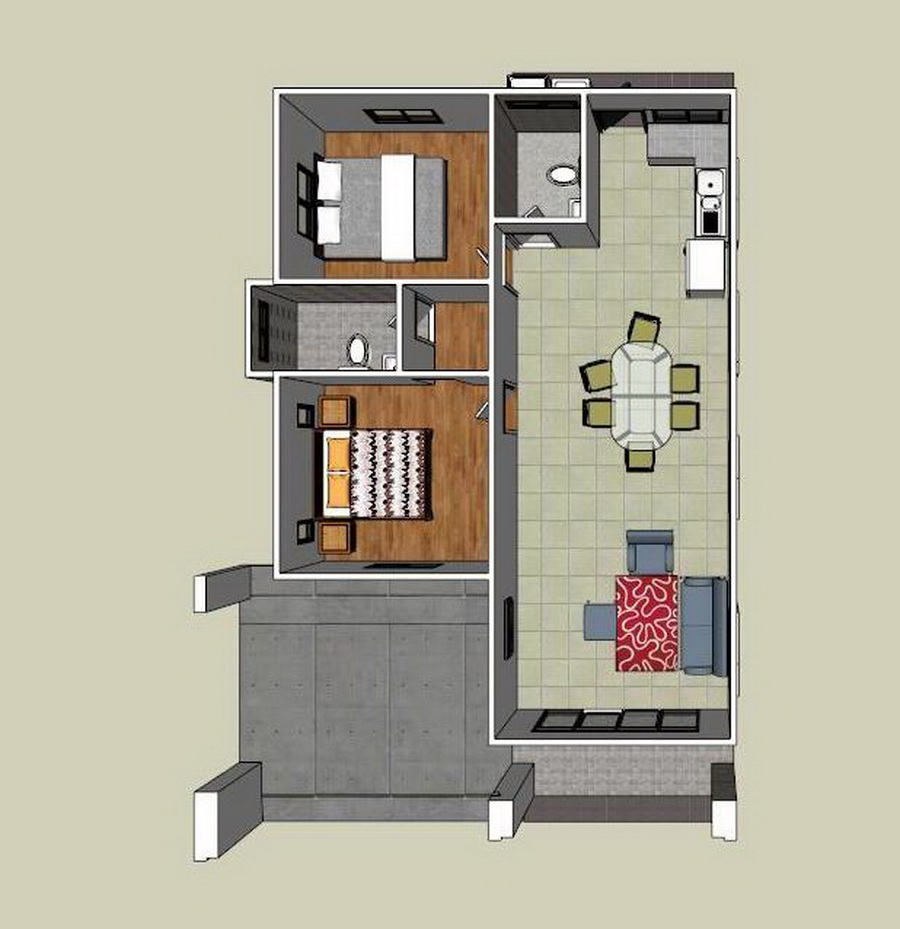จากแบบแปลนภายใน เมื่อเราเข้ามาในบ้านก็จะพบกับโถงใหญ่ที่ออกแบบยาว แบ่งเป็นห้องนั่งเล่น ห้องรับประทานอาหาร ห้องครัวและห้องน้ำ ในขณะที่ด้านข้างจะเป้นห้องนอนทั้งสองห้อง