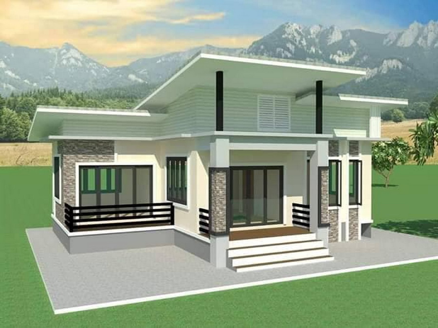 แบบบ้านหลังนี้เป็นบ้านหน้ากว้างสไตล์โมเดิร์น ออกแบบหลังคาทรงเพิงหมาแหงนที่ให้ความโดดเด่นกับตัวบ้านทรงสี่เหลี่ยมได้เป็นอย่างดี ผนังภายนอกเลือกใช้โทนสีขาวครีมยืนพื้น แซมด้วยผนังลายหินและโทนสีดำ ทำให้บ้านไม่ดูจืดชืดจนเกินไป