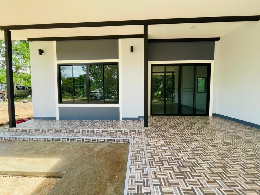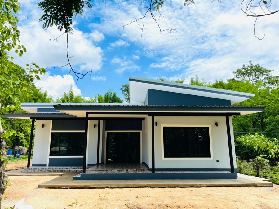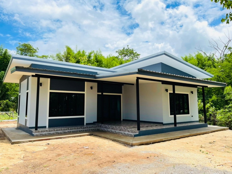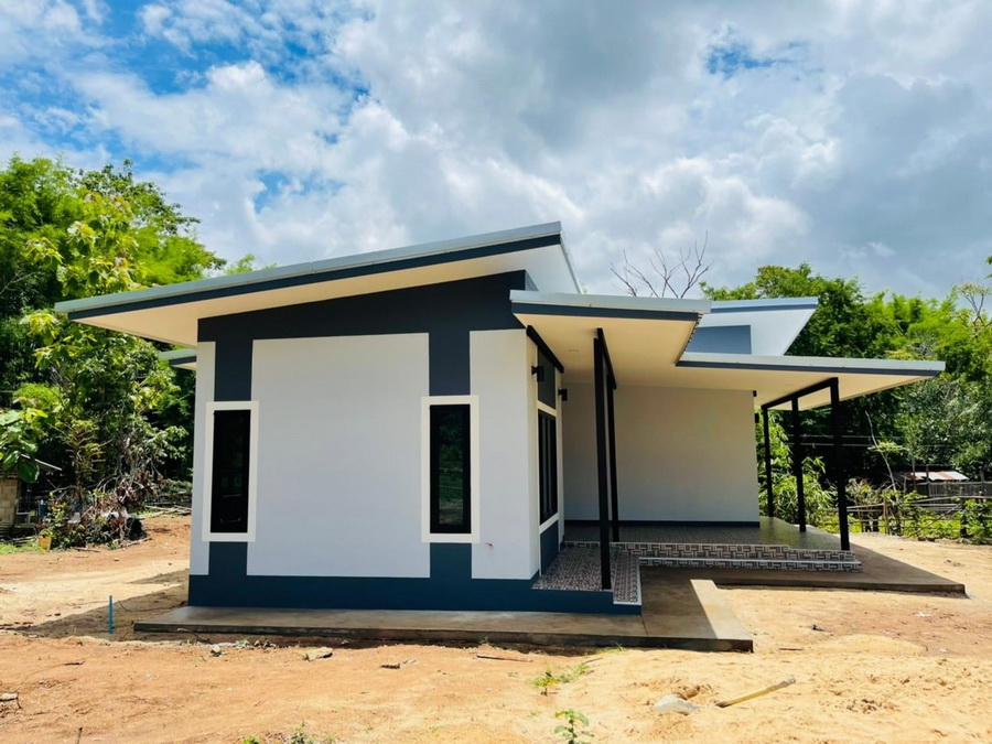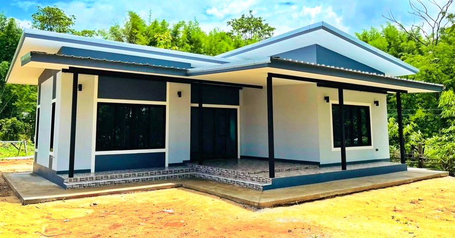 บ้านชั้นเดียวทรงโมเดิร์นรูปตัวแอล (L-Shape House) หลังนี้ประกอบไปด้วย 2 ห้องนอน 2 ห้องน้ำ 1 ห้องรับแขก พื้นที่ใช้สอยทั้งหมดประมาณ 87 ตารางเมตร งบก่อสร้างทั้งหมดประมาณ 815,000 บาท