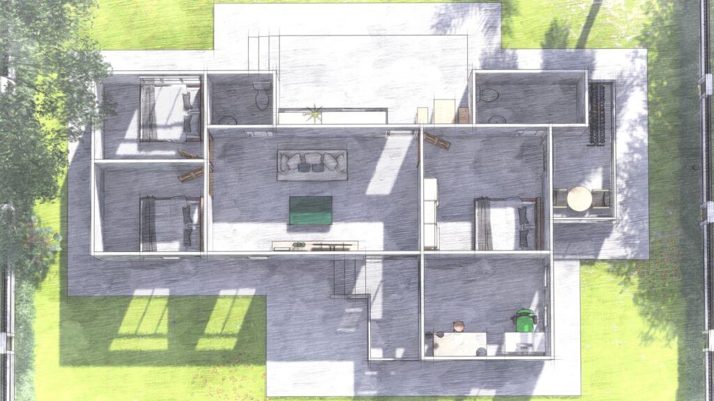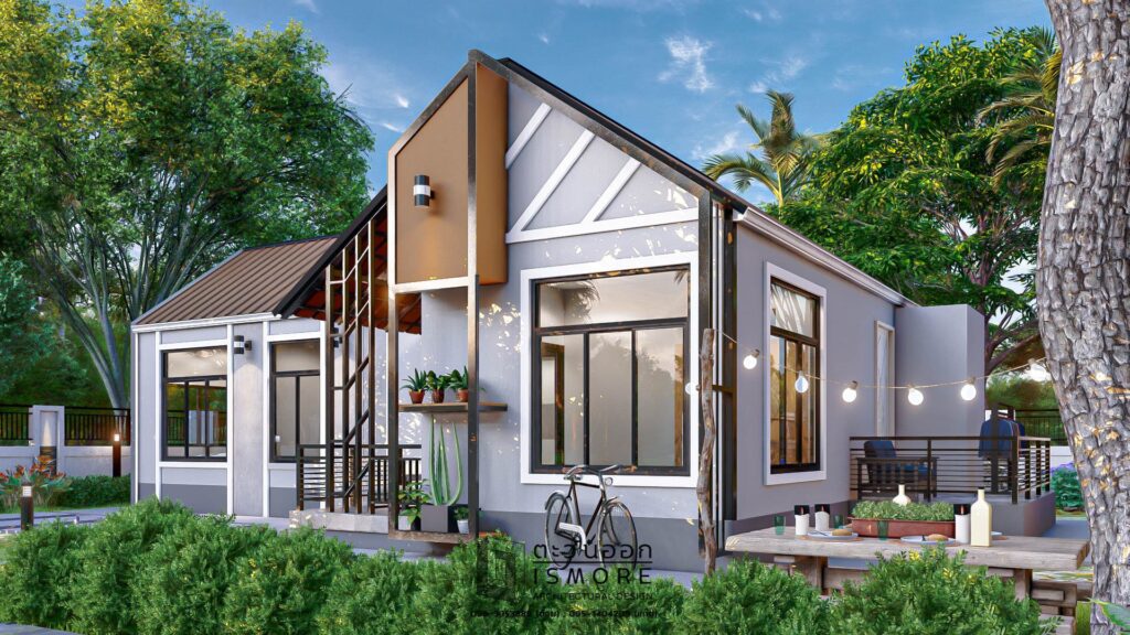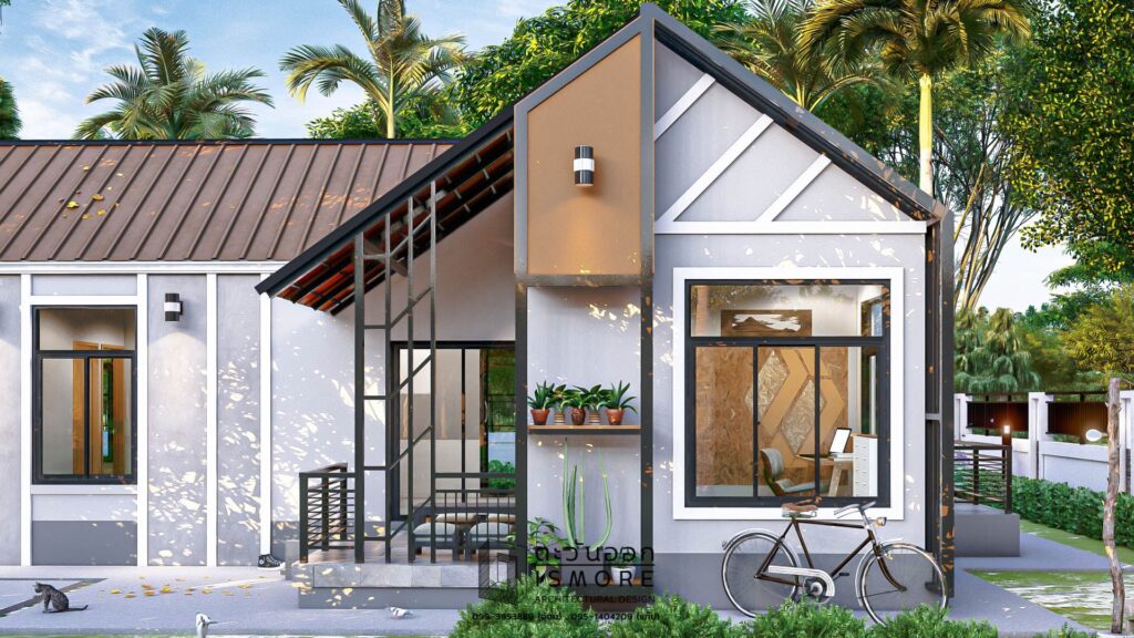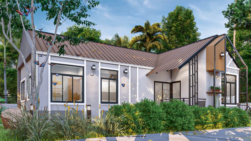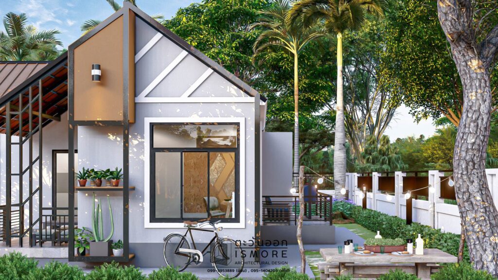 ลักษณะตัวบ้านชั้นเดียว หลังคาทรงจั่ว ดีไซน์รูปทรงหน้ากว้าง ผนังภายนอกตกแต่งด้วยโทนสีเทาอ่อน ตัดขอบเทาเข้มบริเวณด้านล่าง ตกแต่งฟาซาดส่วนหน้าสุดด้วยเหล็กระแนงสีดำ ให้ภาพลักษณ์บ้านโมเดิร์นที่เน้นเส้นสายเรขาคณิตเป็นหลัก