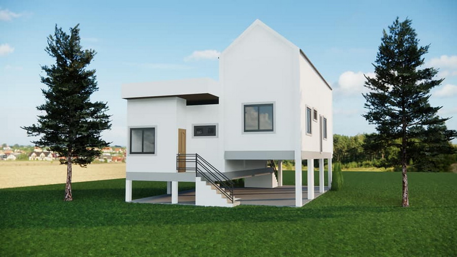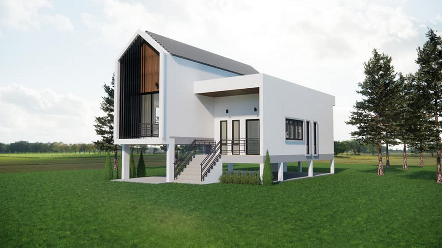 แบบบ้านหลังนี้เป้นบ้านชั้นเดียว ตัวบ้านมีการออกแบบยกพื้นใต้ถุนขึ้นสูง ดีไซน์หลังของบ้านจะมีเส้นสายที่ชัดเจนตามลักษณะของเรขาคณิต มีหลังคาคาในแบบ A-frame พร้อมกับการตกแต่งในโทนสีขาวสว่างทั้งหลัง ซึ่งให้กลิ่นอายความเป้นนอร์ดิกได้อย่างชัดเจน