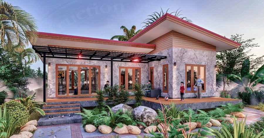 สำหรับบ้านหลังนี้เป็นแบบบ้านขนาดชั้นเดียว ตัวบ้านถูกออกแบบด้วยสไตล์โมเดิร์นในรูปทรงตัวแอล จึงให้บรรยากาศบ้านที่ดูทันสมัย สวยงาม นอกจากนี้ผนังภายนอกยังตกแต่งด้วยปูนเปลือยแบบลอฟท์อีกด้วย หลังคาของบ้านเป็นหลังคาแบบเรียบ ผสานไปกับแบบเพิงหมาแหงน