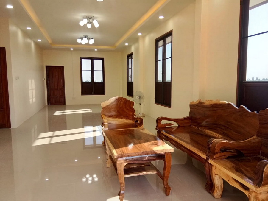 ภายในบ้านมีพื้นที่ใช้สอยที่กว้าง ผนังภายในตกแต่งในโทนสีขาวครีม พร้อมกับโคมไฟระย้าดีไซน์หรูหรา ซึ่งเป็นการรวมองค์ประกอบให้บ้านสวยงามน่าอยู่