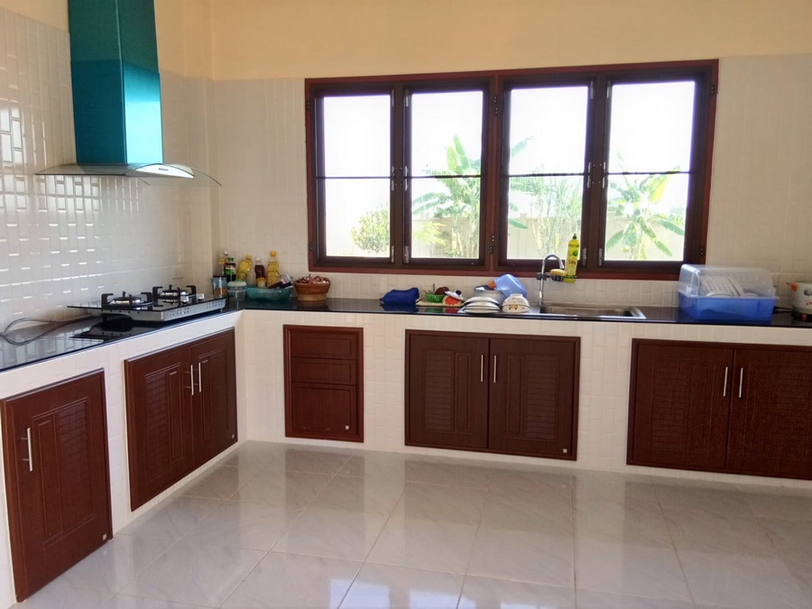 สำหรับห้องครัวของบ้านเป็นอีกห้องที่มีพื้นที่กว้างและโปร่งสบาย จึงสามารถถ่ายเทอากาศและควันได้ดี ภายในถูกติดตั้งด้วยเคาน์เตอร์ครัวแบบติดผนังรูปทรงตัวแอล