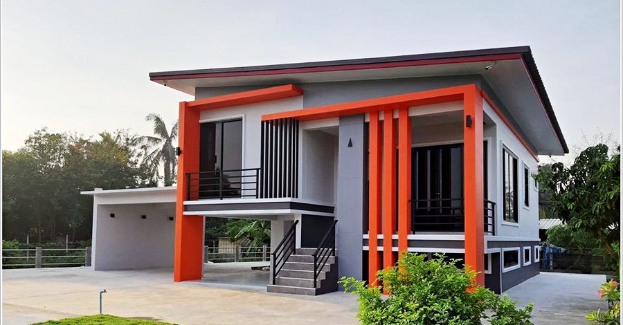บ้านหลังนี้เป็นบ้านชั้นเดียว ดีไซน์แบบเล่นระดับ หลังคาเพิงหมาแหงน ลาดเอียดไปทางด้านข้าง โครงสร้างยกพื้นสูง มีพื้นที่ใต้ถุนบ้านและลานจอดรถยื่นออกมาด้านข้าง ผนังภายนอกเลือกใช้สีเทา ขาว ตัดด้วยสีส้มสดใส ทำให้บ้านหลังนี้สวยงาม โดดเด่นยิ่งขึ้น