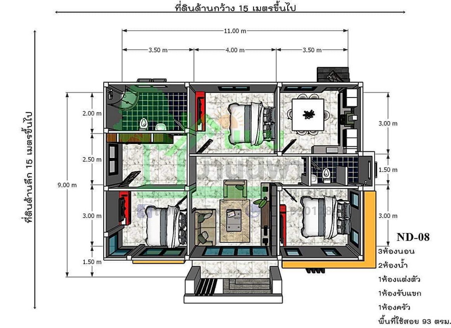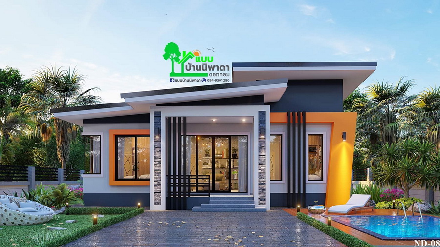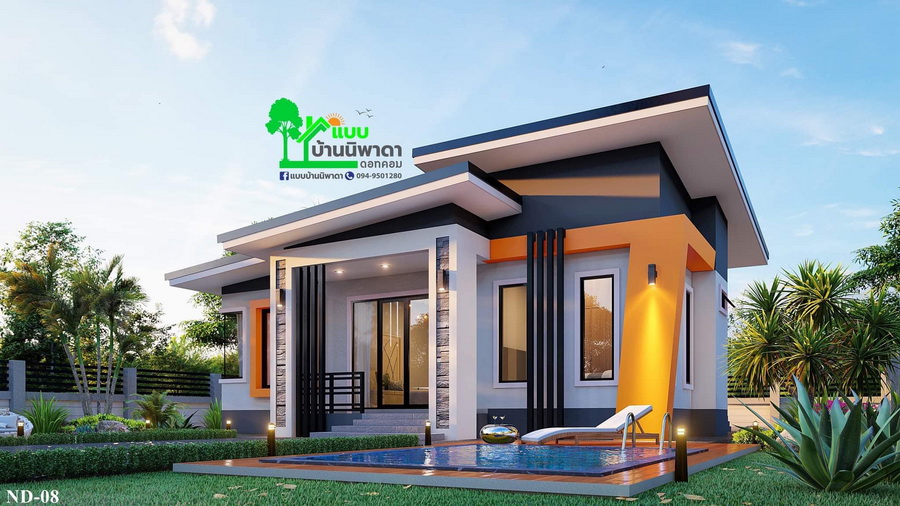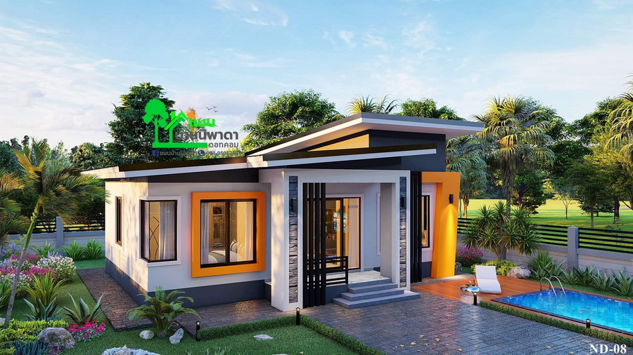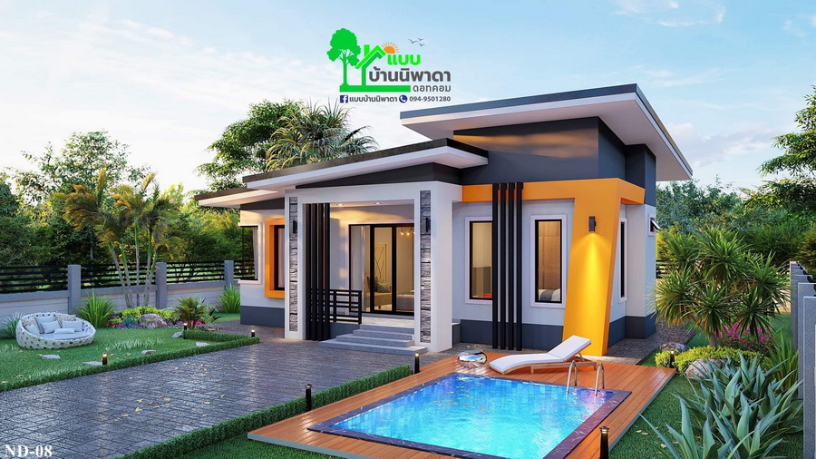 แบบบ้านสไตล์โมเดิร์นหลังนี้ประกอบไปด้วย 3 ห้องนอน 2 ห้องน้ำ 1 ห้องโถงนั่งเล่น 1 ห้องแต่งตัว 1 ห้องครัว 1 ห้องรับแขก พื้นที่ใช้สอยทั้งหมดประมาณ 93 ตารางเมตร งบก่อสร้างเริ่มต้นที่ 1.1 ล้านบาท (ไม่รวมสระน้ำ)