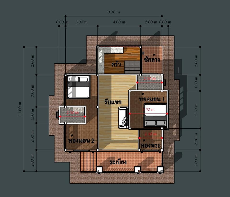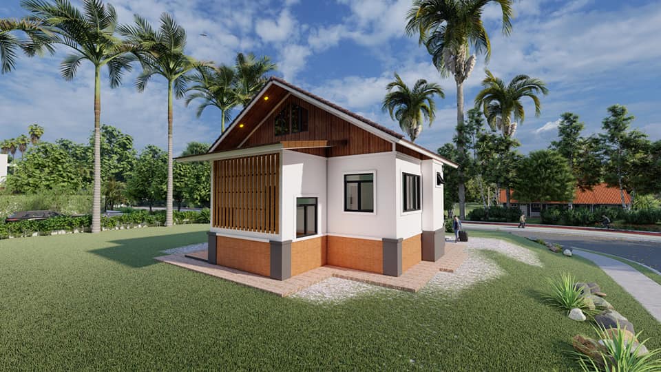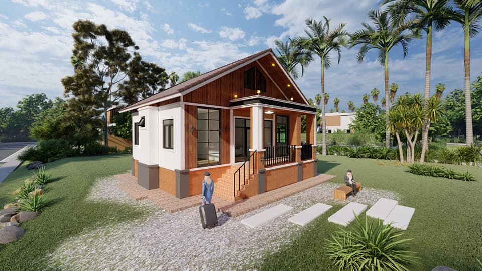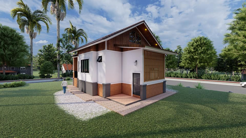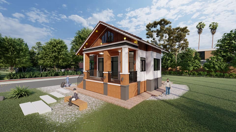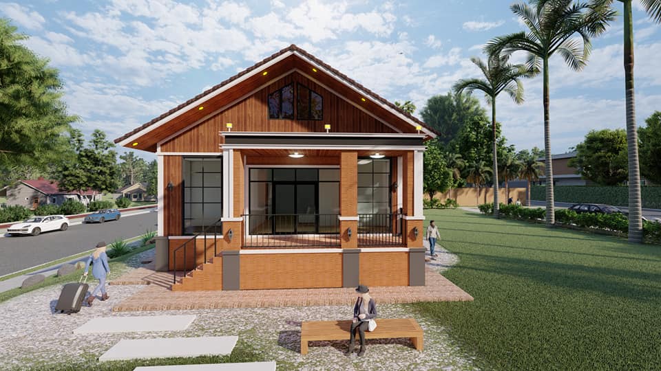 แบบบ้านชั้นเดียวยกพื้นสูงสไตล์คอนเทมโพรารี ตกแต่งในโทนสีน้ำตาลอบอุ่นสวยงาม 2 ห้องนอน 1 ห้องน้ำ พื้นที่ 95 ตร.ม.