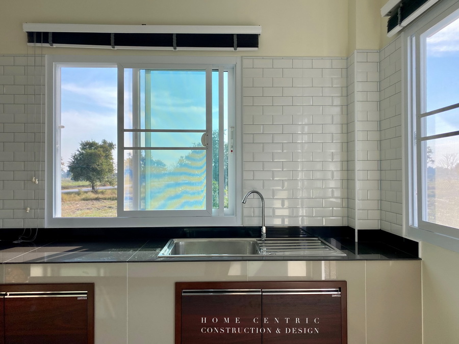 สำหรับห้องครัวนั้น ถูกออกแบบอย่างเรียบง่าย โดยจะเน้นในเรื่องของความเปิดโล่ง จึงเหมาะกับการทำอาหารไทยที่มีกลิ่นและควันค่อนข้างมาก